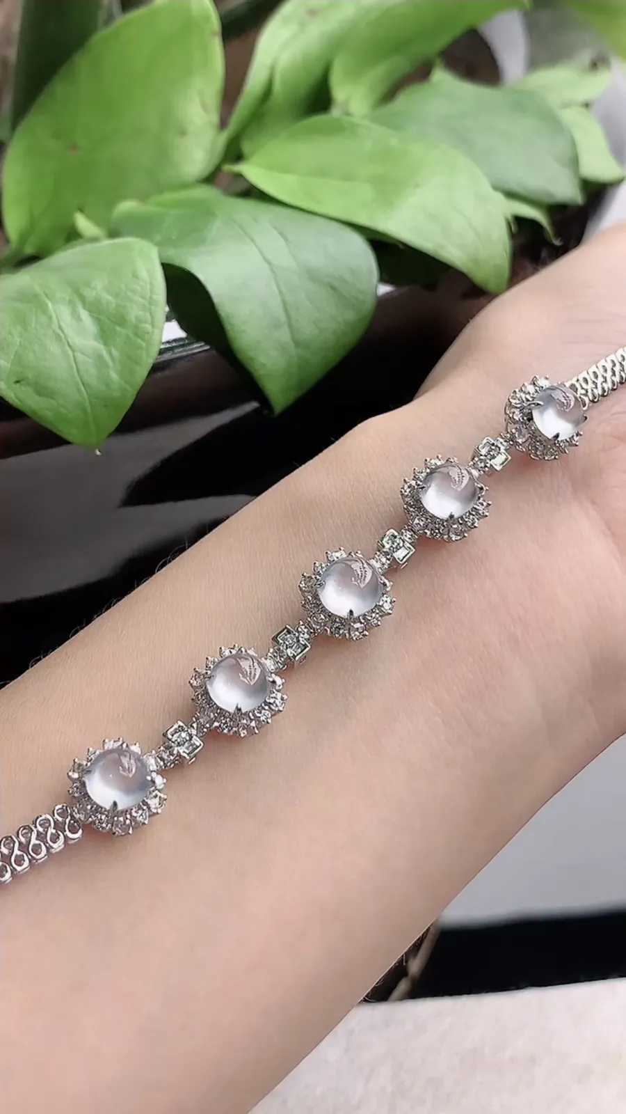 a货翡翠高冰种18K金伴钻镶嵌白月光蛋面手链 尺寸7×6.3×8mm 重量9.60g 1210