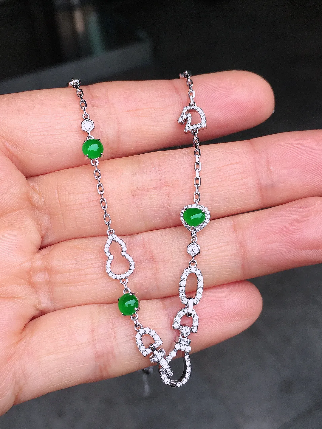 18k金钻镶嵌冰种貔貅手链 玉质细腻 色泽艳丽清新 整体尺寸10.8*7.6*6