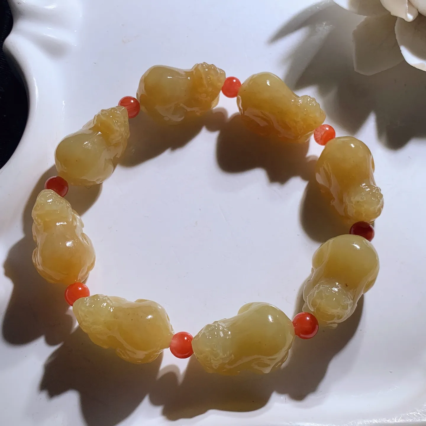 新疆和田玉且末糖招财进宝貔貅手串 单颗尺寸20/14/14重45克 无裂无杂 玉质细腻油润 底色纯净