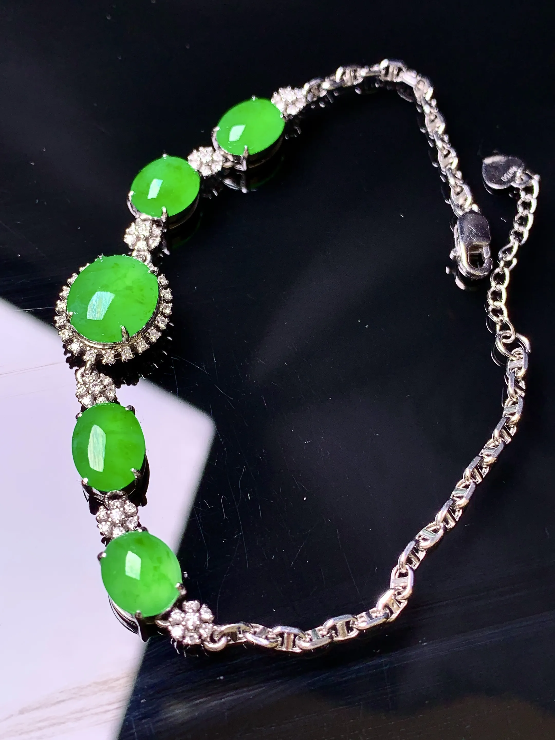18金钻镶嵌满绿蛋面手链 玉质细腻 色泽清新艳丽 整体尺寸75.5*11*6.2