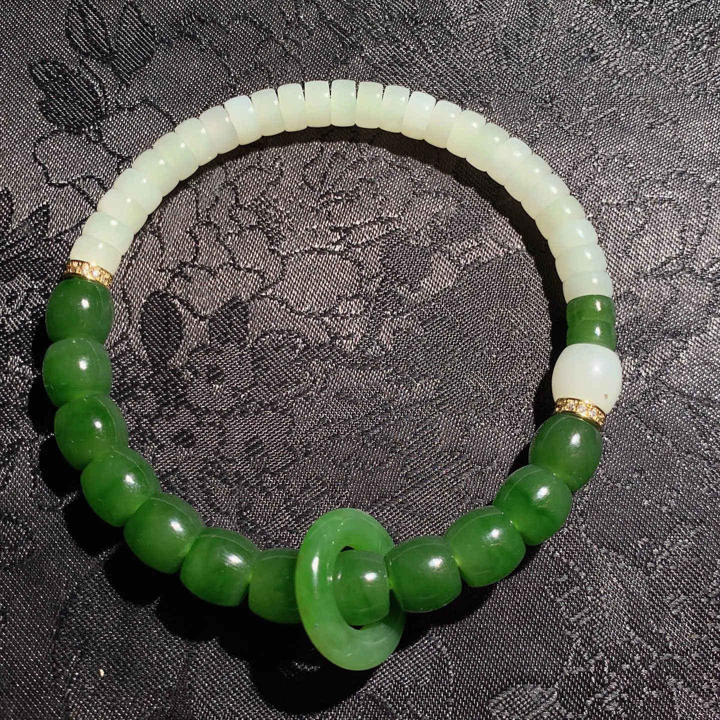 和田玉鲜阳绿俄罗斯碧玉直切手串 单颗尺寸7/8重21克。玉质细腻油润。手推出油。佩戴高端典雅。lt2