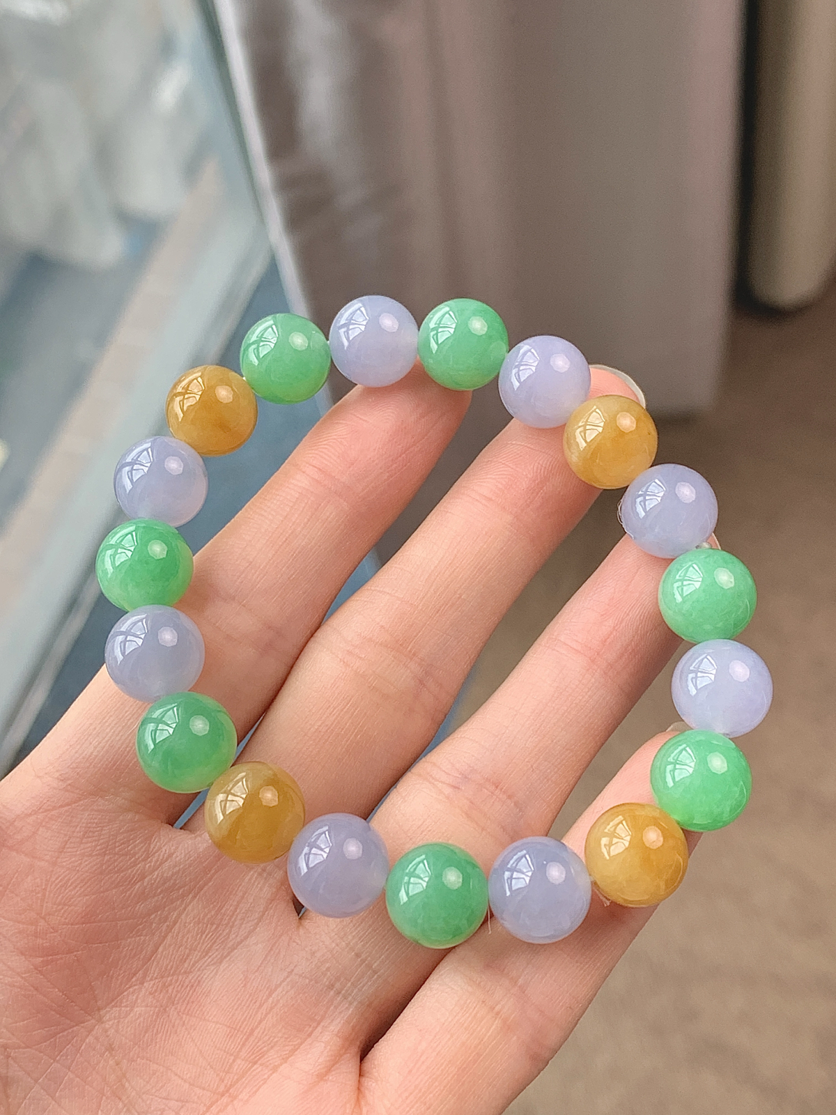 天然A货翡翠四彩算盘珠手串尺寸5.9-3.7重量:14.74g4月9日 工厂直销收藏佳品,种好水足,