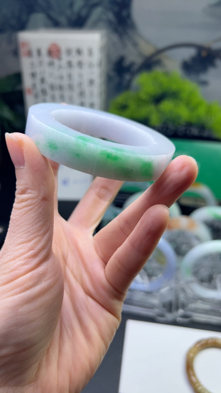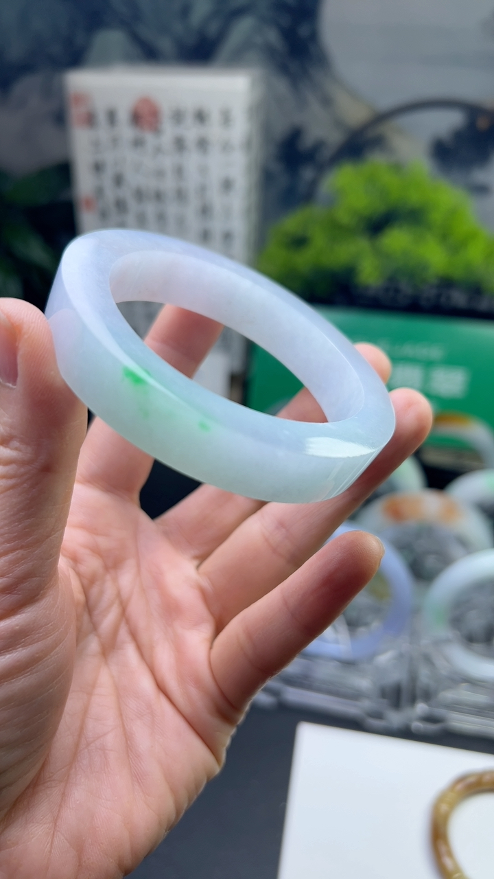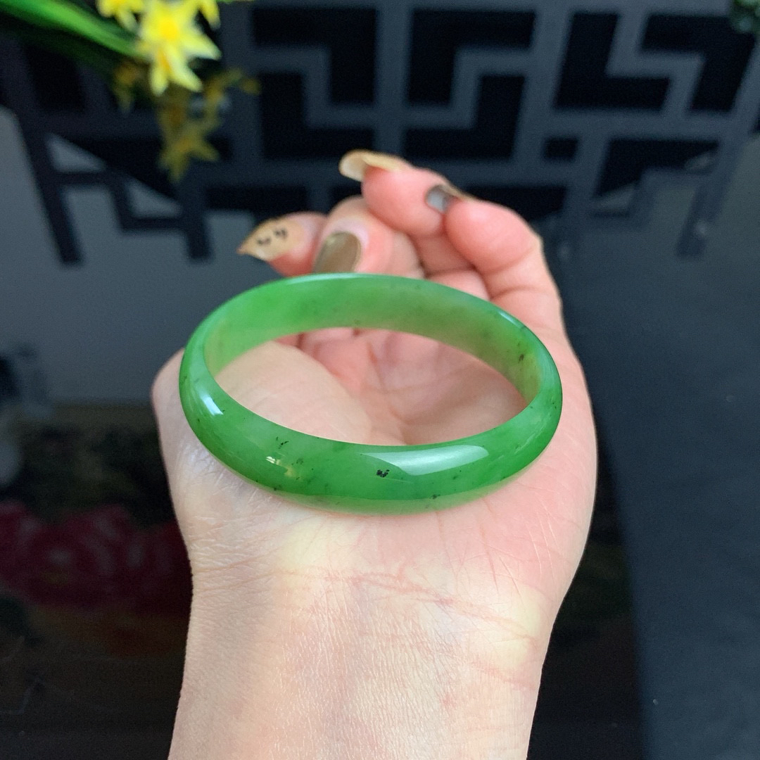 和田玉53圈口苹果绿宽条碧玉手镯!玉质细腻油润 底色纯净 无裂无棉 脂粉好,品质好