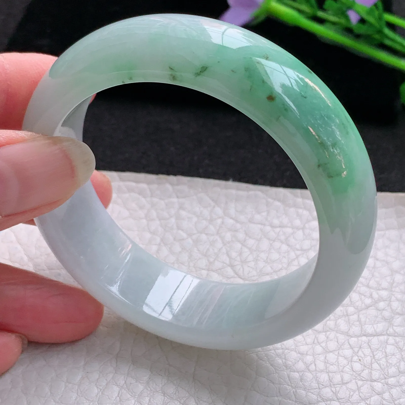 ee实拍56.5*13*7.8平安镯 天然缅甸翡翠飘绿玉手镯双彩宽边玉手环