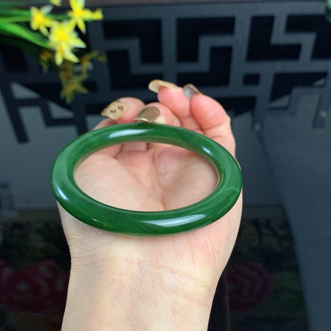 和田玉56.5圈口菠菜绿圆条碧玉手镯!玉质细腻油润 底色纯净 无纹裂 脂粉好,品质好!