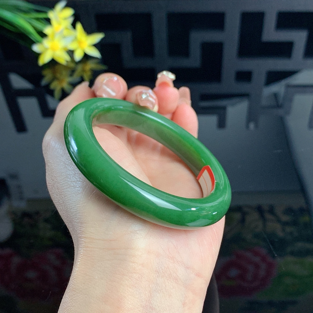土豪款,和田玉56.5圈口菠菜绿碧玉手镯!玉质细腻油润 底色纯净 无裂无杂 脂粉好,品质高。