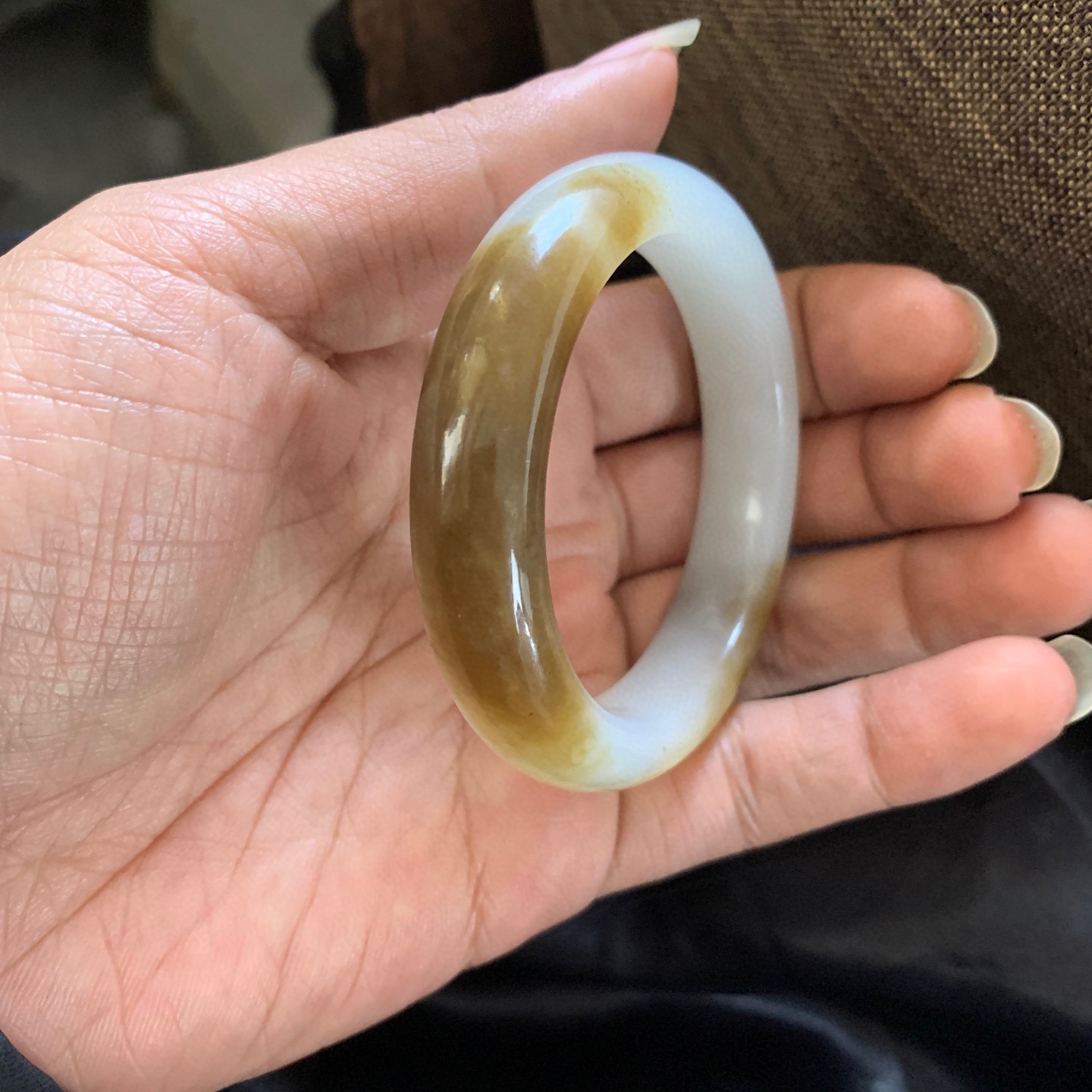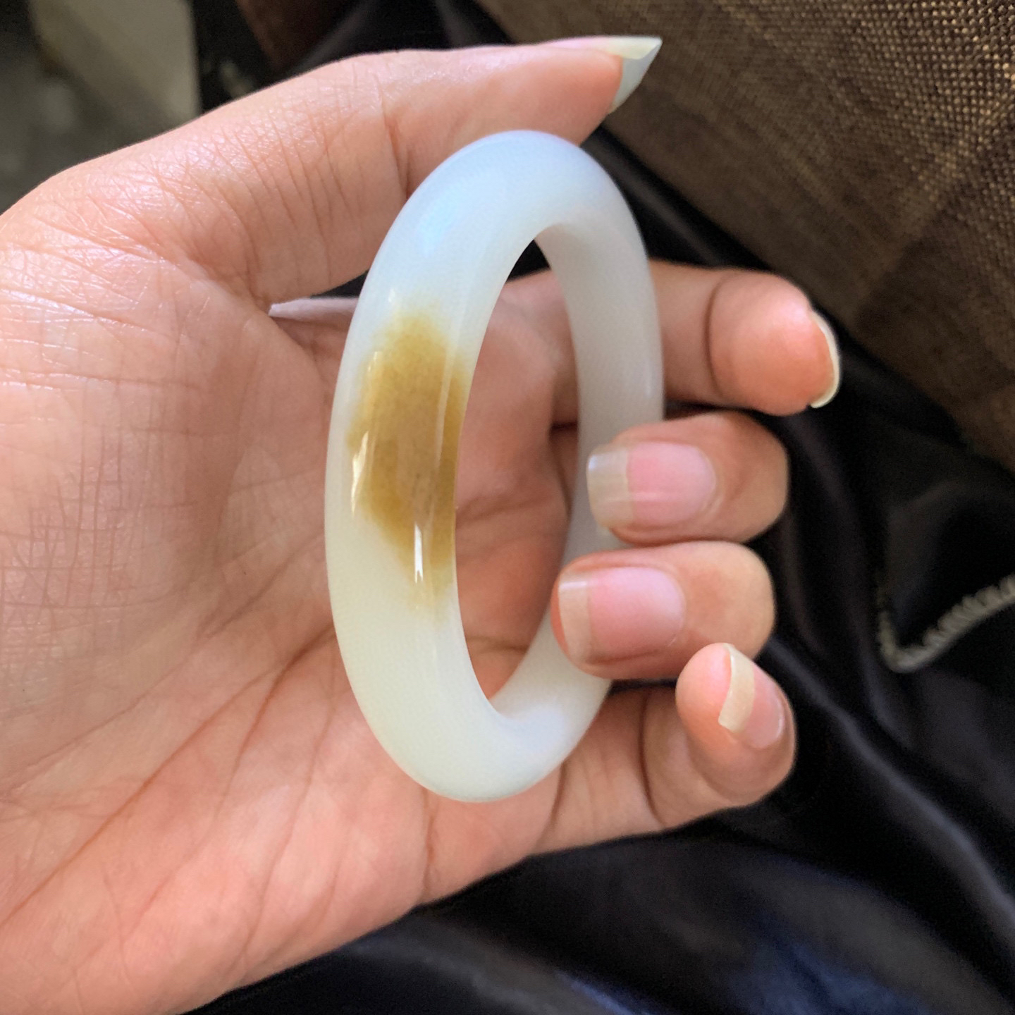 和田玉51.2圈口且末糖料手镯,镯型古朴典雅。在诗情画意的雨巷相遇,你是我腕间的一抹风情,有你眸有深