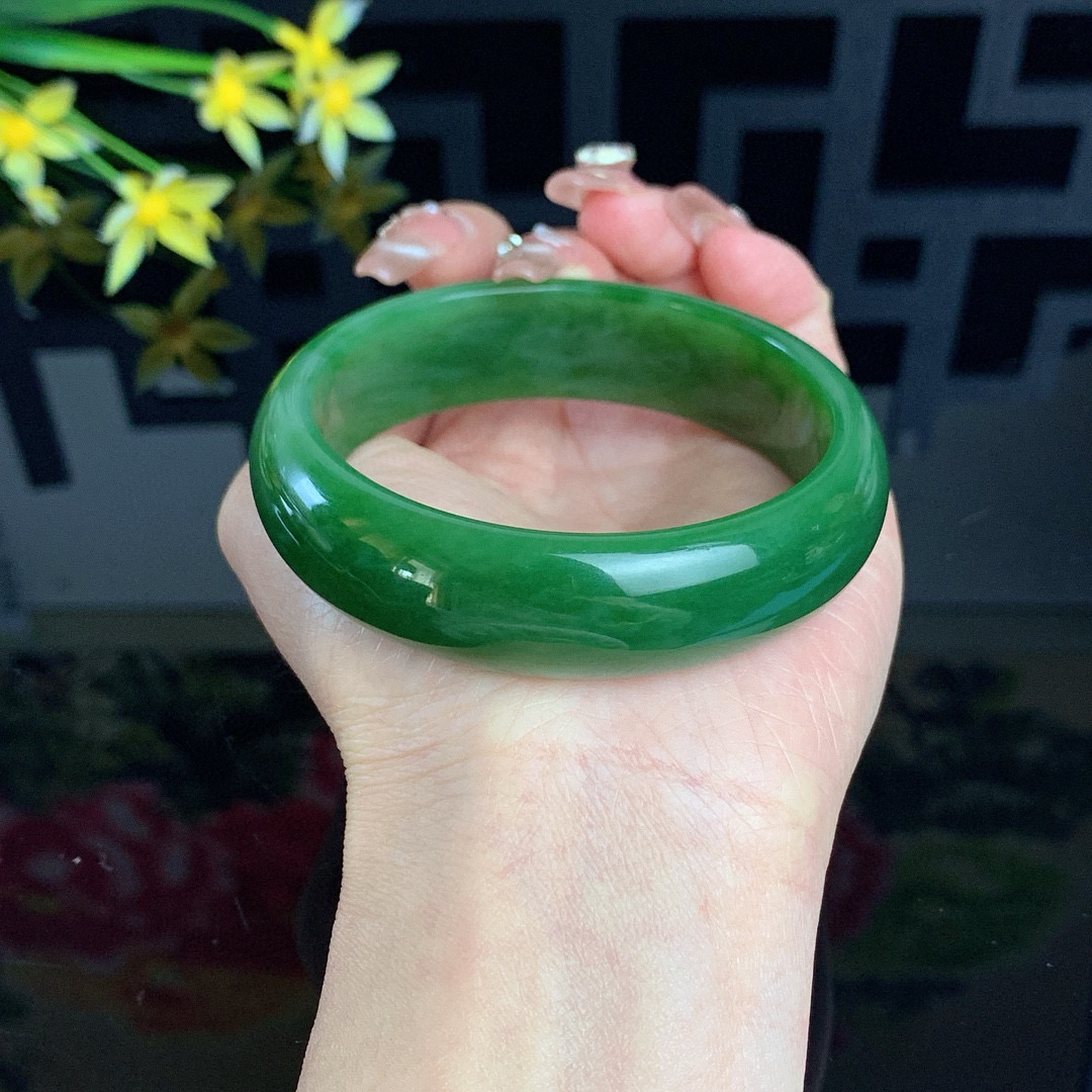 收藏款,和田玉60圈口菠菜绿宽版碧玉手镯!玉质细腻油润 底色纯净 无裂无杂 脂粉好,品质高。