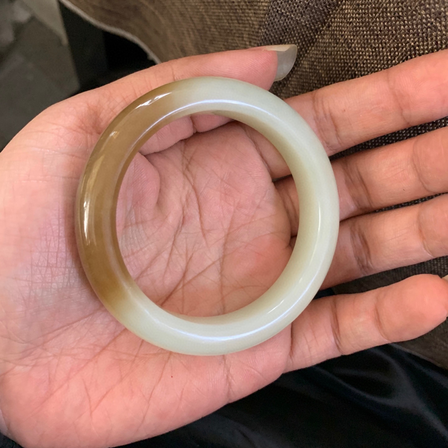 和田玉55圈口且末糖料手镯,镯型古朴典雅。在诗情画意的雨巷相遇,你是我腕间的一抹风情,有你眸有深情.
