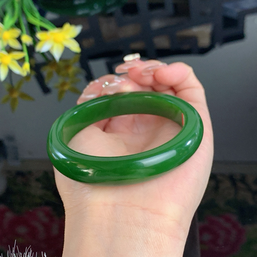 珍藏品,和田玉56圈口菠菜绿碧玉手镯!玉质细腻油润 底色纯净 无裂无杂 脂粉好,品质高。