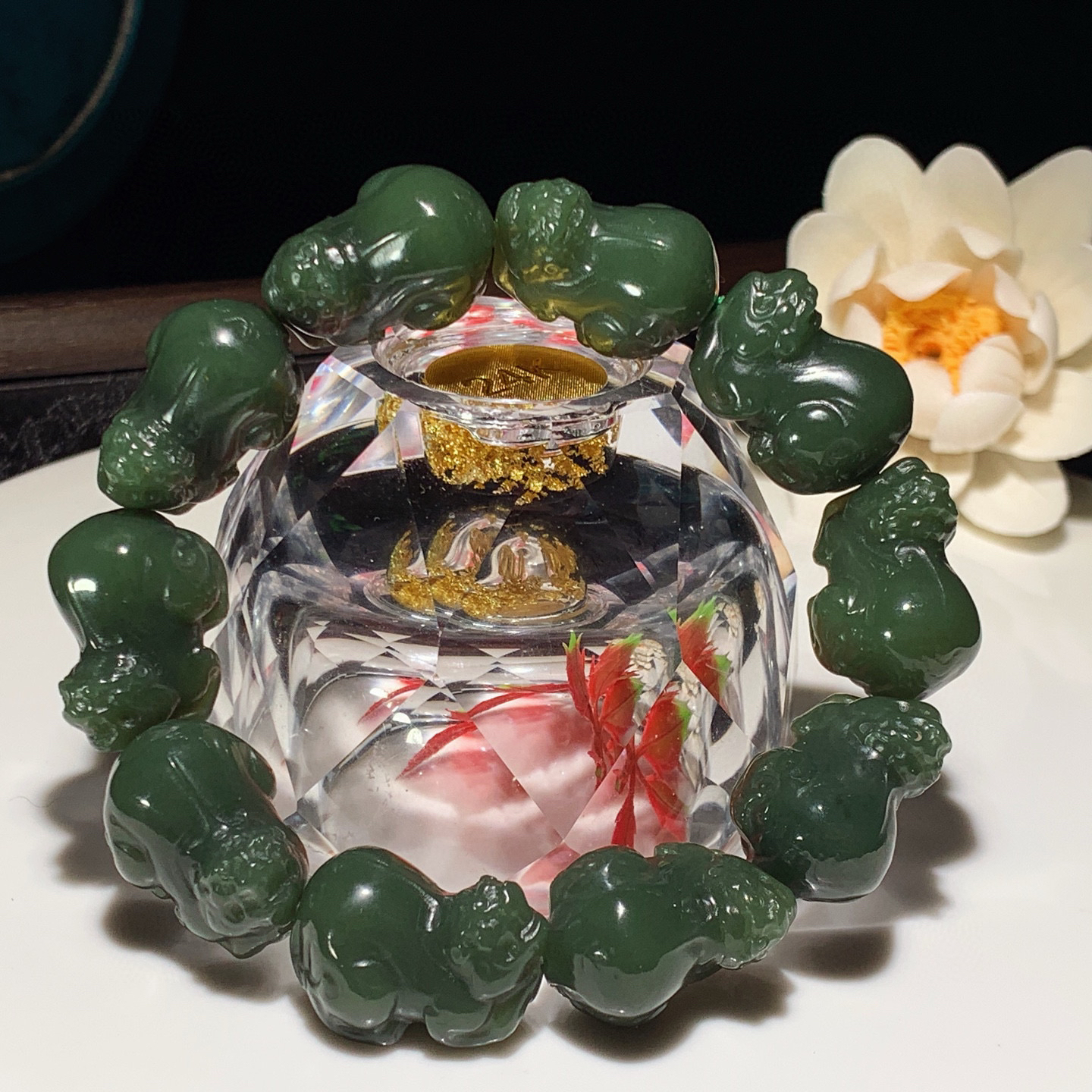 和田玉湖水绿貔貅手串。规格23无裂无杂 玉质细腻油润 底色纯净 脂粉好,品质好。