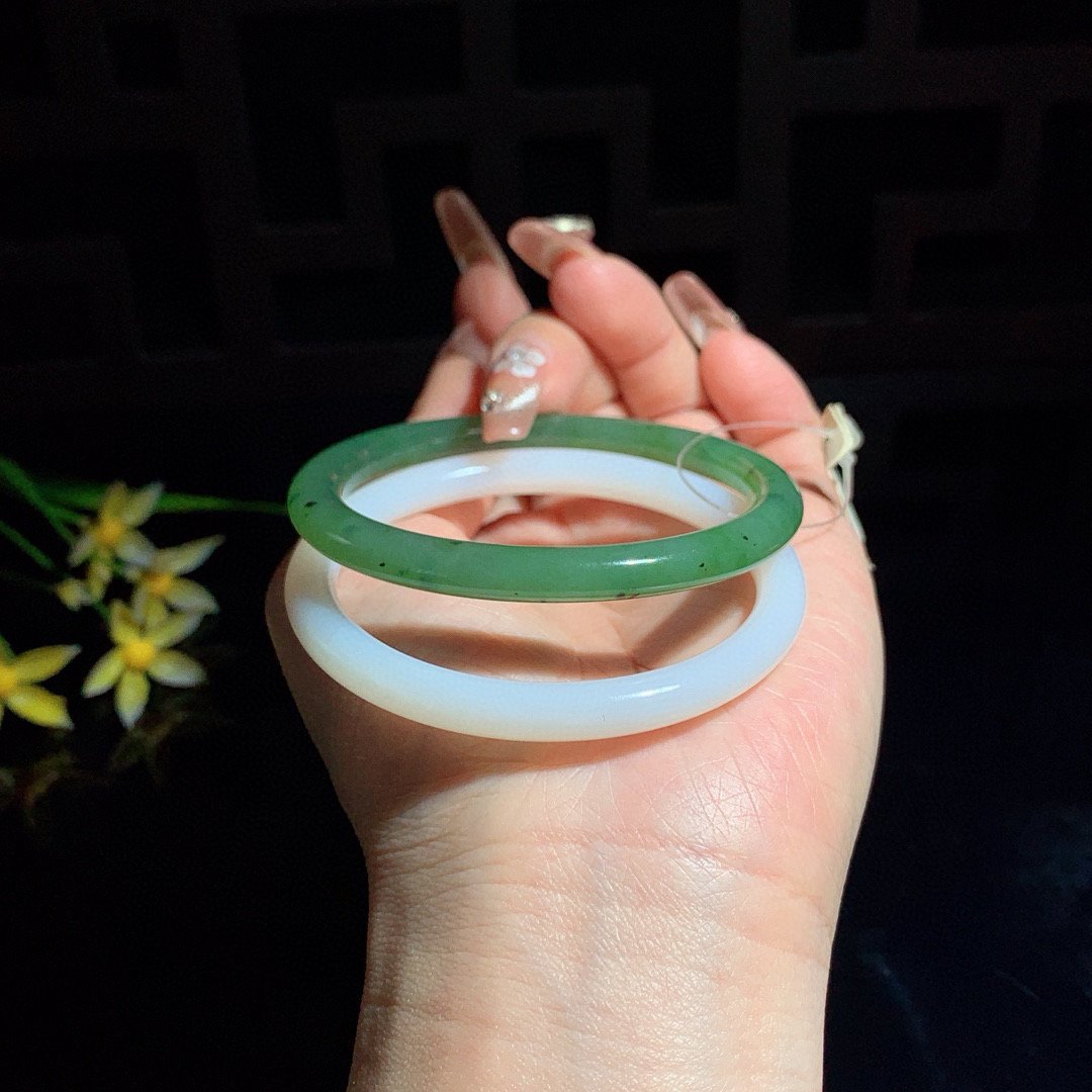 和田玉54圈口白玉加碧玉对镯手镯,玉质细腻油润 底色纯净 无裂无棉 脂粉好,品质好