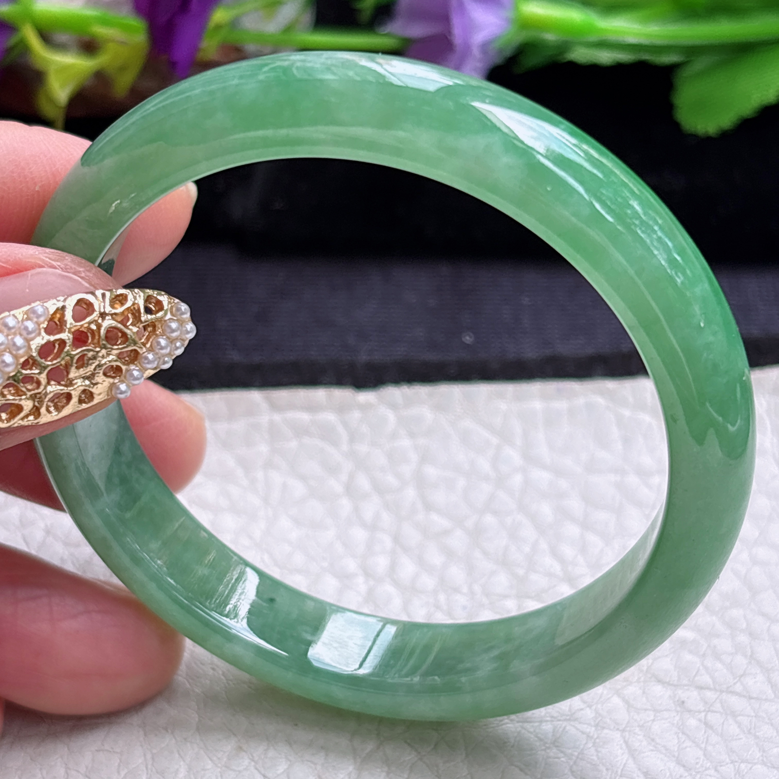 n小圈口52*8叮当镯 缅甸翡翠a货手镯飘绿秀气圆条美人镯
