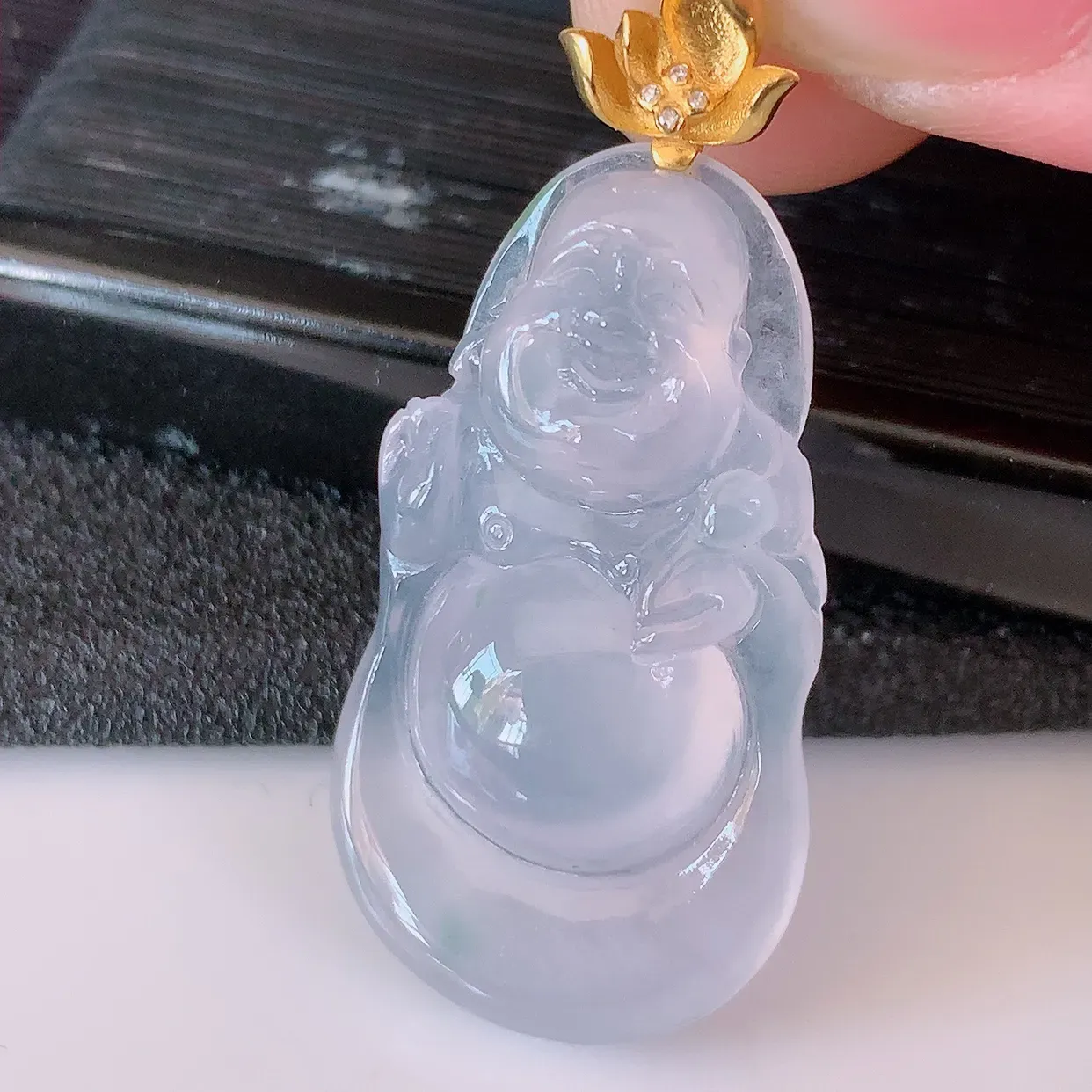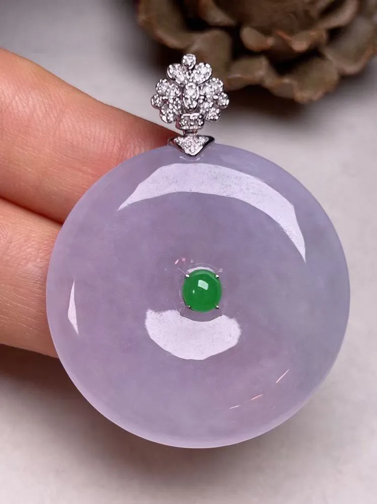 冰糯种淡紫罗兰平安扣吊坠、真金真钻镶嵌,种水好,玉质细腻 .裸石尺寸 32.5*