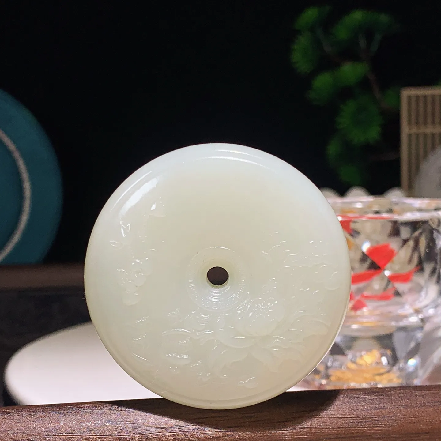 和田玉白玉花开富贵平安扣挂件 尺寸50/10重48克。玉质细腻油润。手推出油品相大气。250109