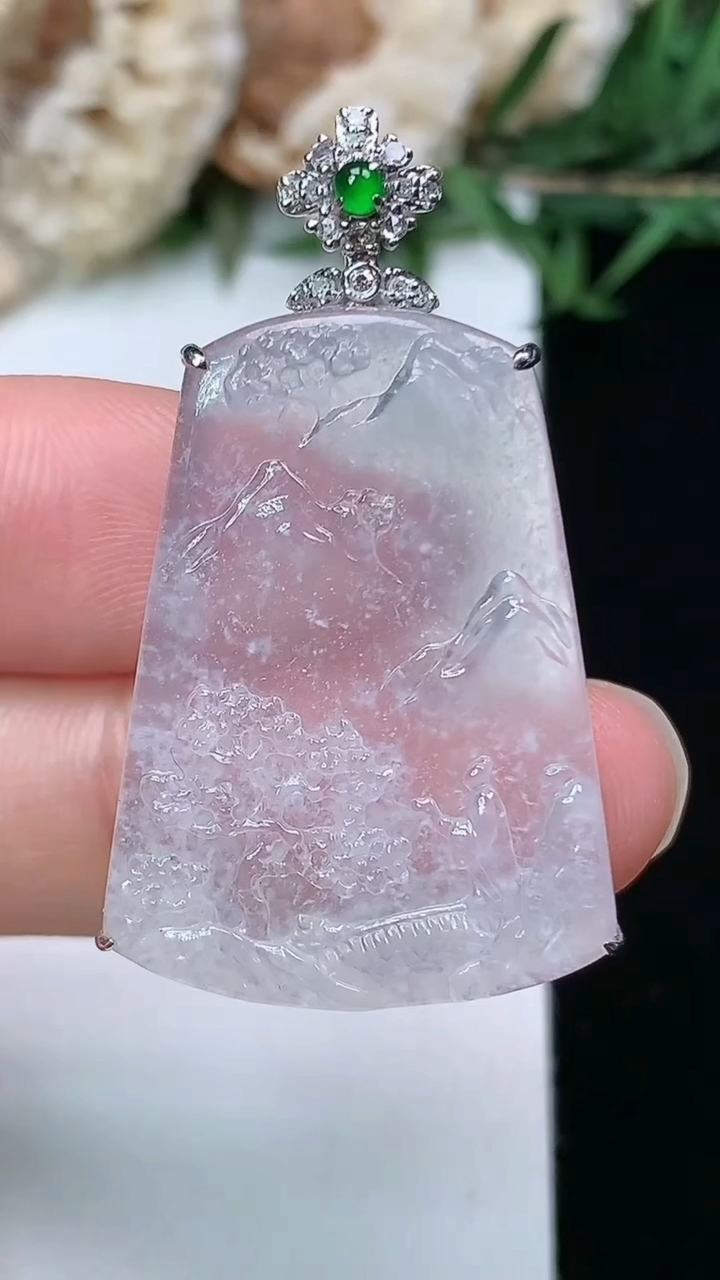 天然A货翡翠白冰山水牌吊坠,尺寸28.6-21.5-6.2,重量:6.48g 3月28日