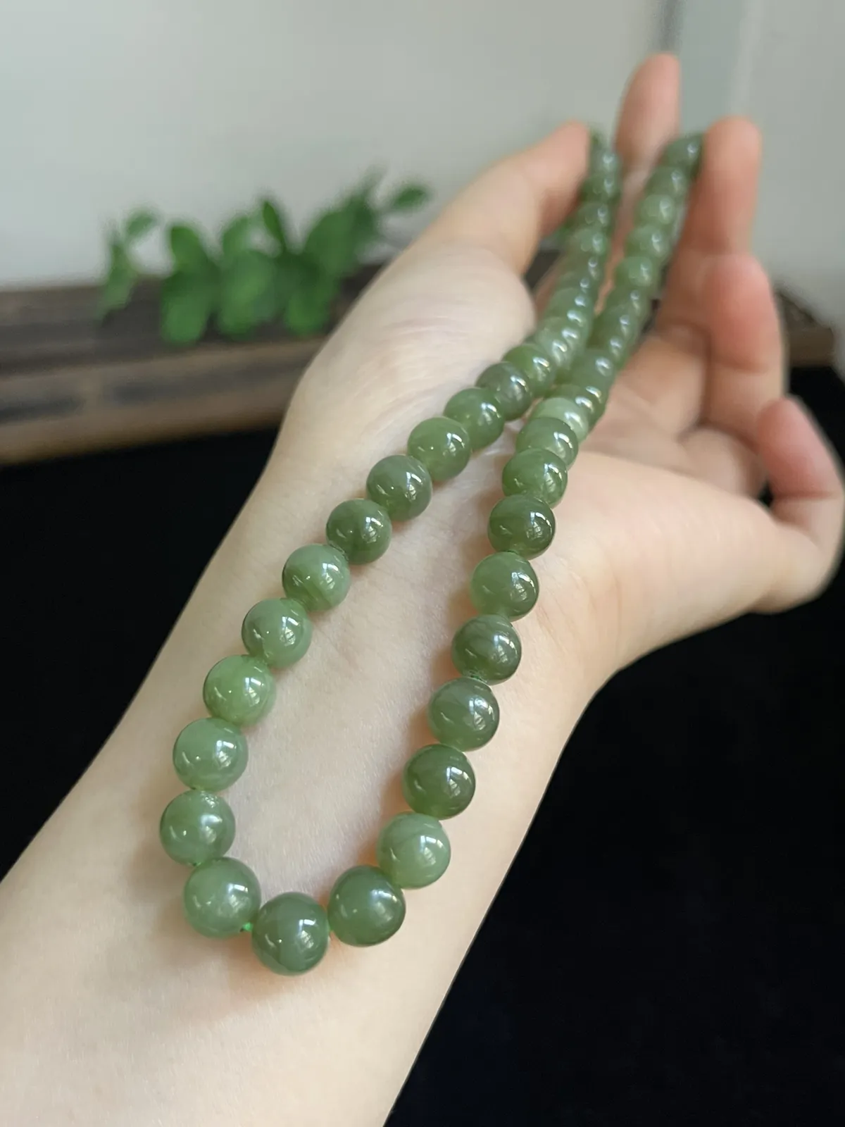 天然和田碧玉项链10mm左右,阳绿,基本无黑点,料子细腻,色泽油亮,水头好,性价比高!!佩戴效果佳,人养玉,玉养人!