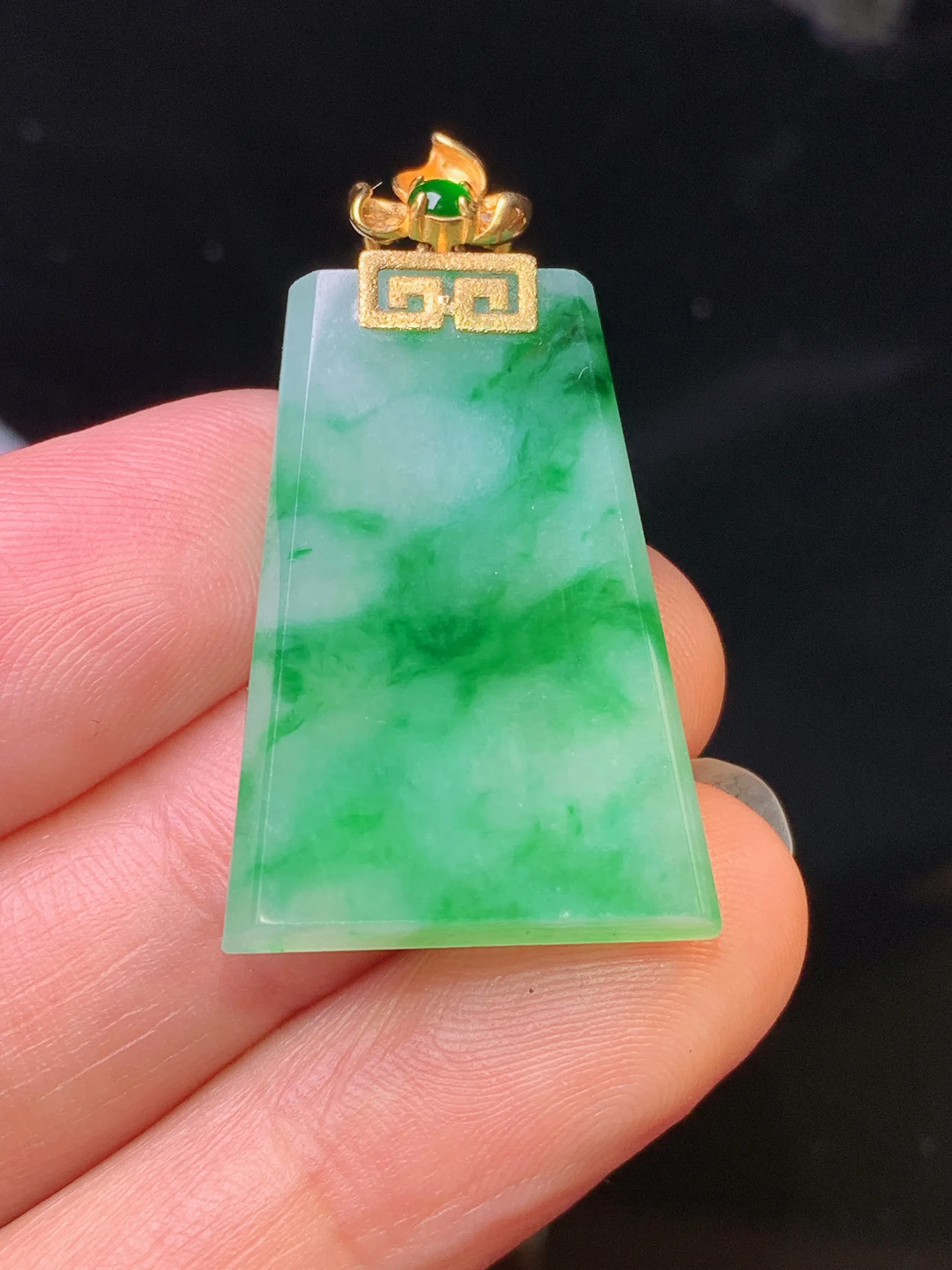 18k金镶嵌飘绿无事牌吊坠 玉质细腻 色泽清新艳丽 整体尺寸36*19.5*3.8