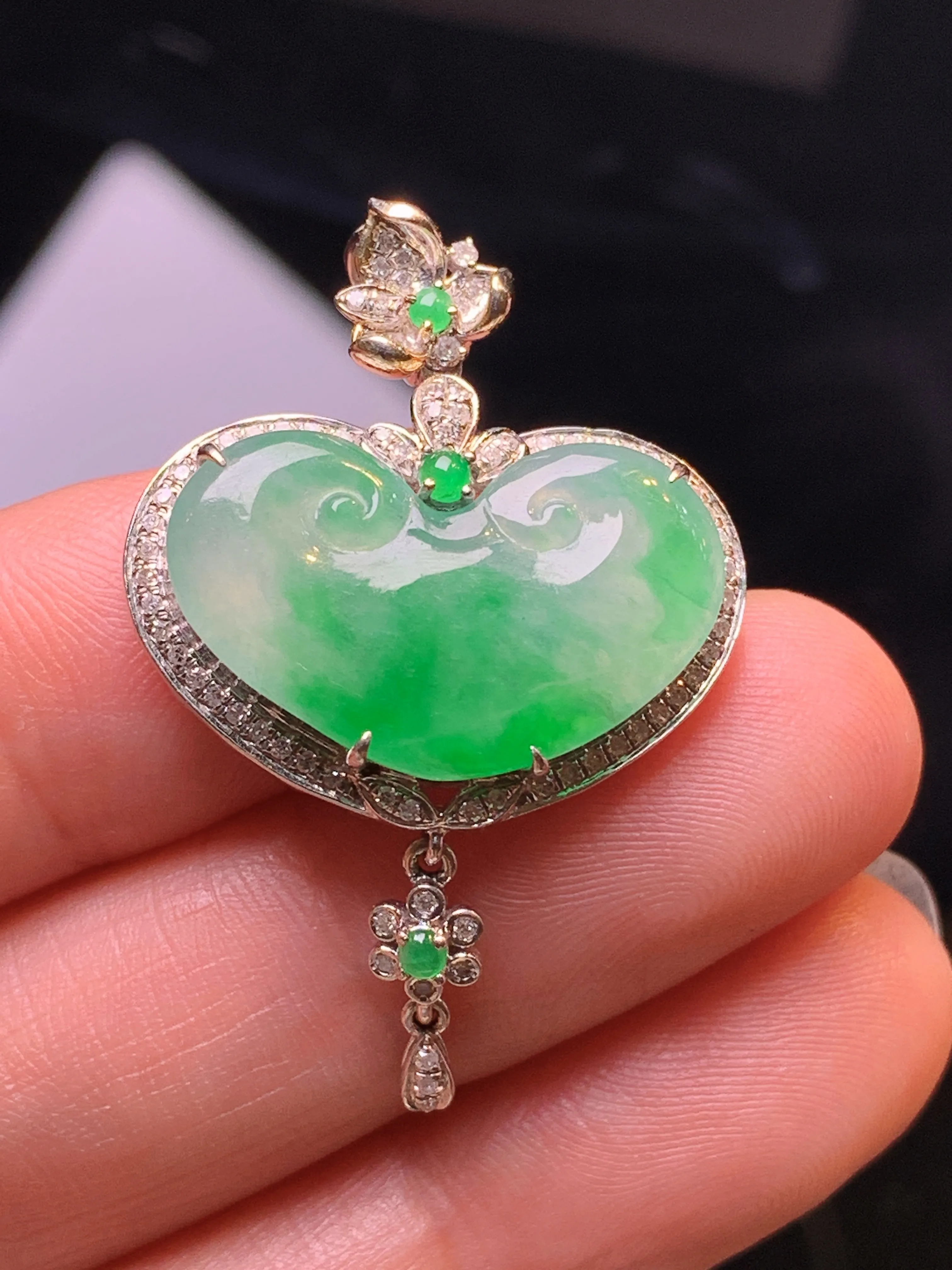 18k金钻镶嵌翠绿如意吊坠 玉质细腻 色泽清新艳丽 整体尺寸35.8*23.6*6.2