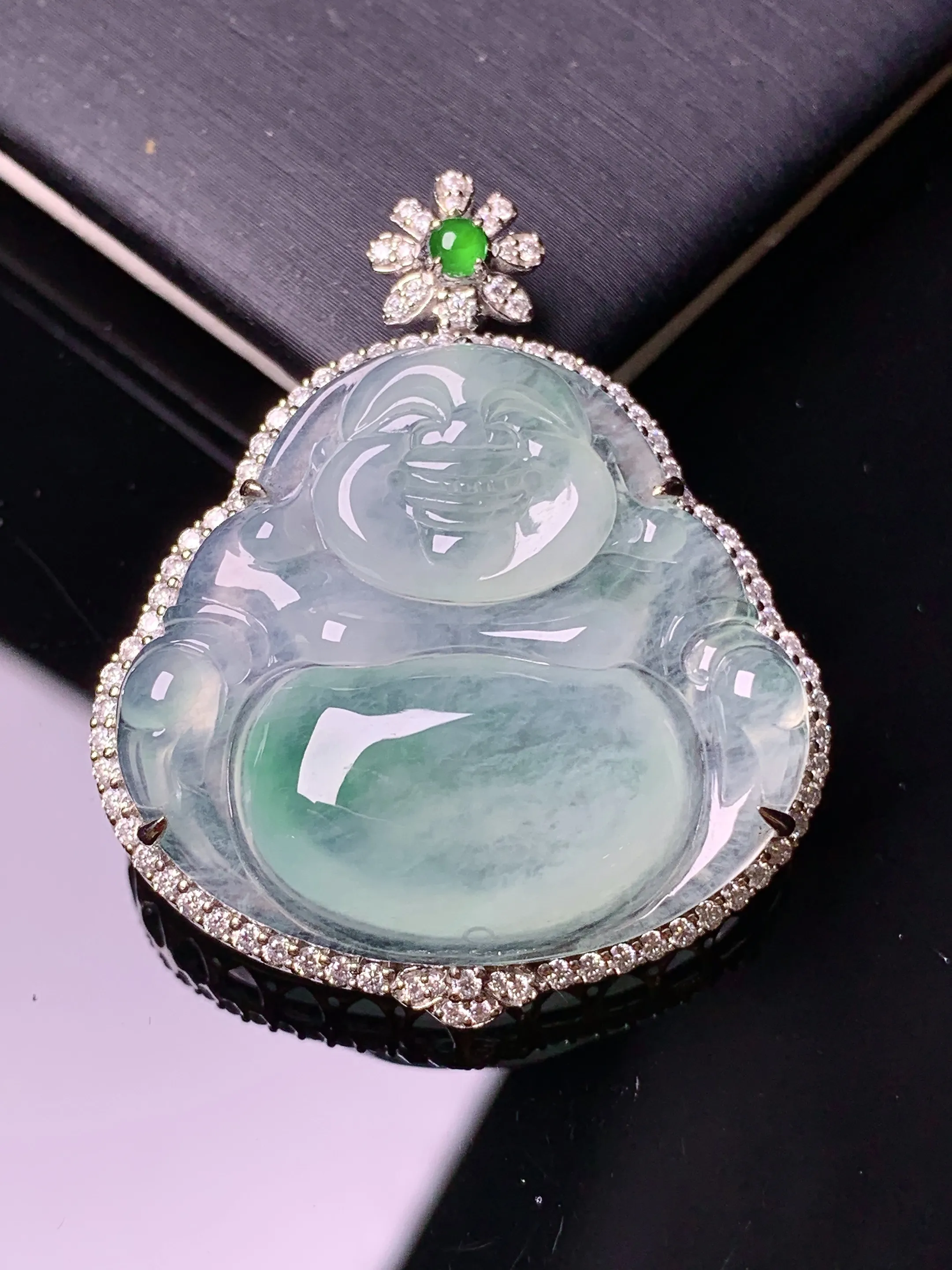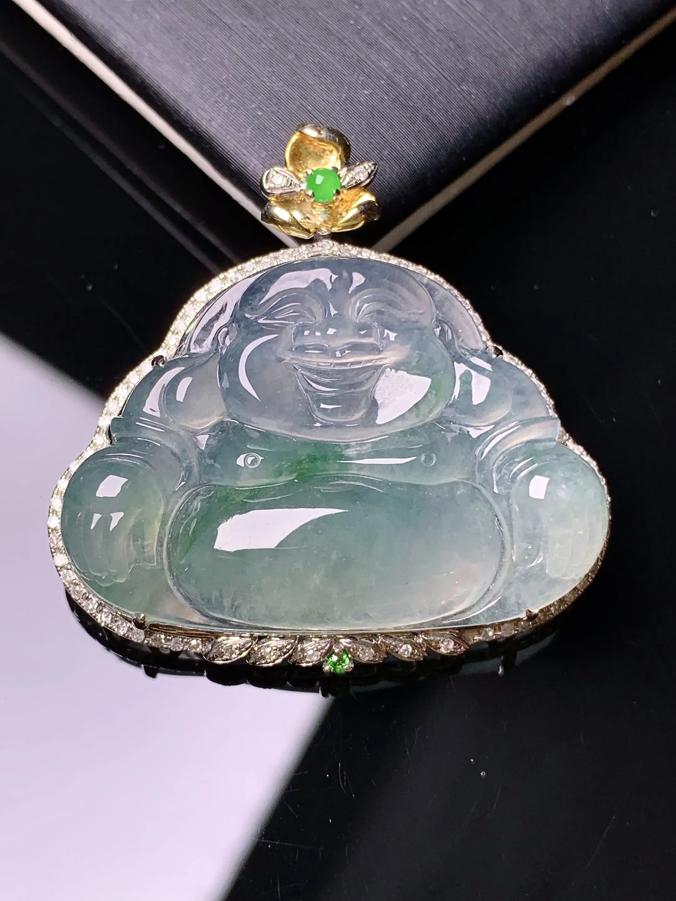 18k金钻镶嵌飘绿佛公吊坠 玉质细腻 色泽清新艳丽 整体尺寸37.5*31.3*9