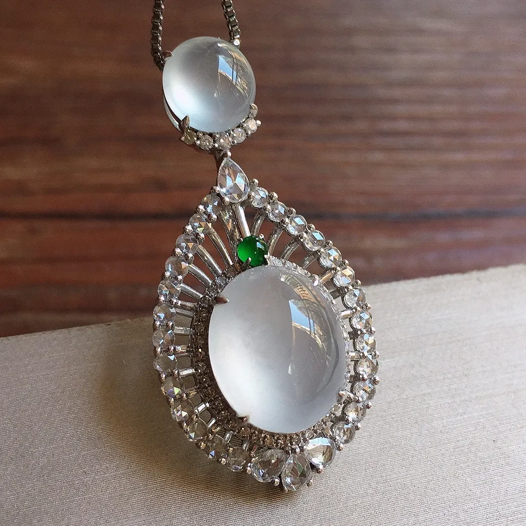 冰种蛋面吊坠,18k金镶嵌,冰润饱满,玉质细腻,种水足,Dd 尺寸38.4*18.7*10.9