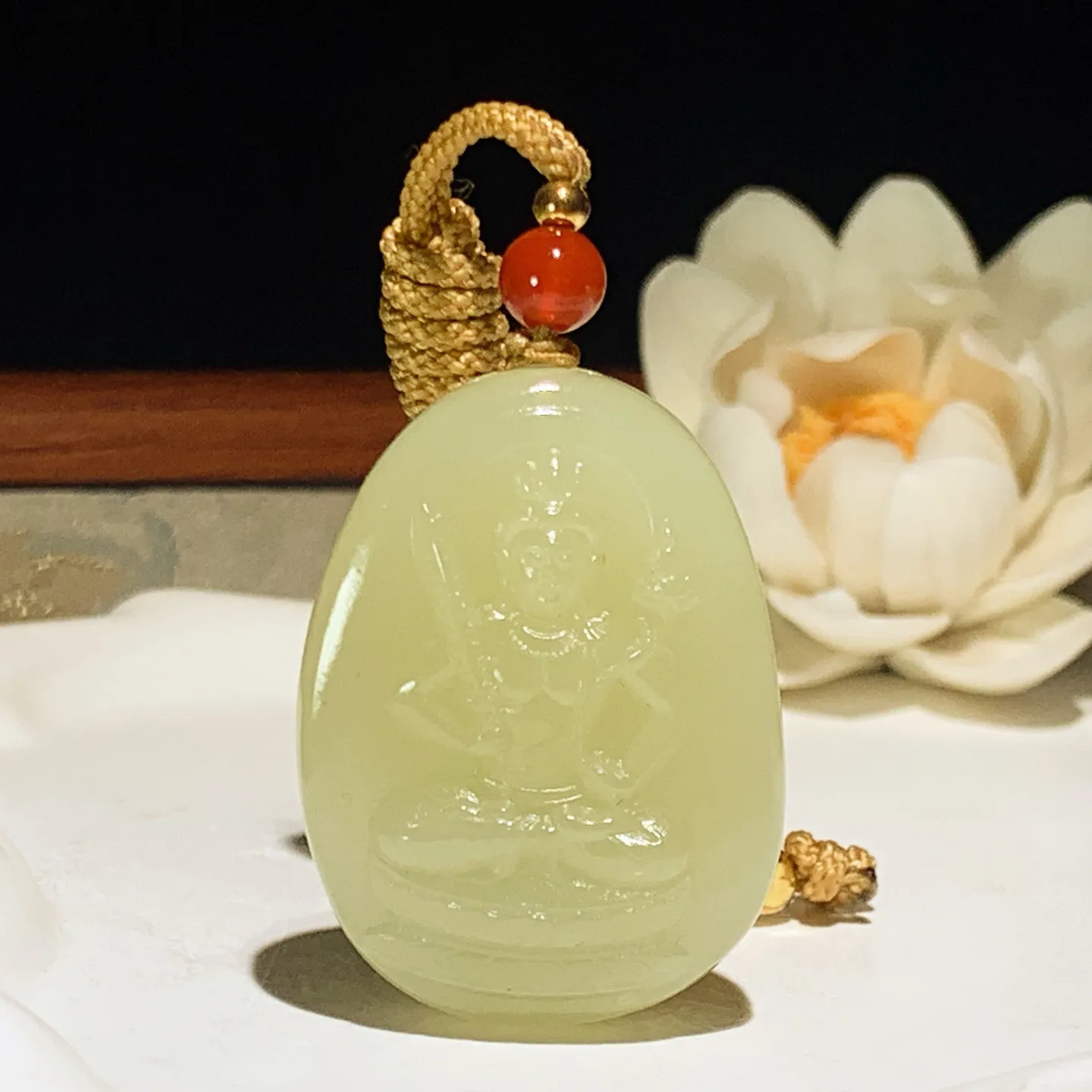 新疆若羌黄口料虚空藏菩萨牌子挂件。尺寸38/28/12重27.5克。玉质细腻油润。手推出油。佩戴高端