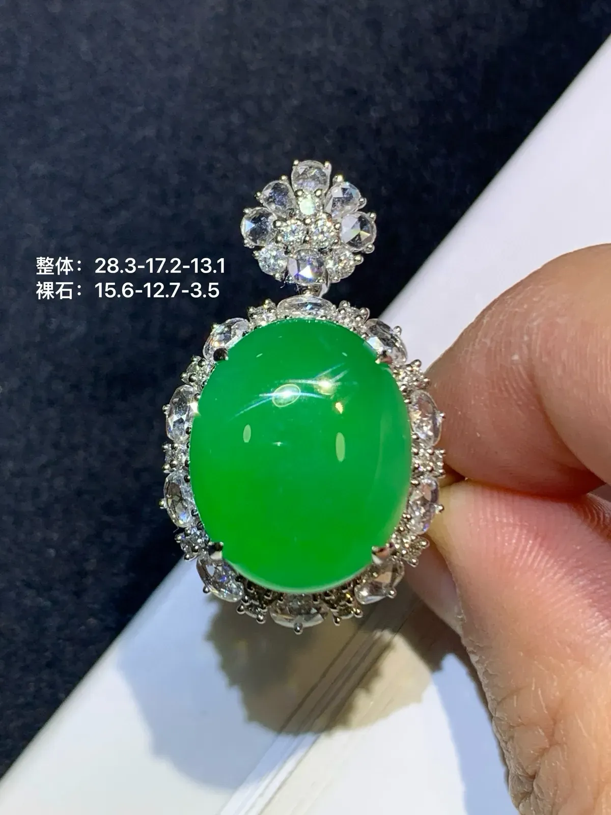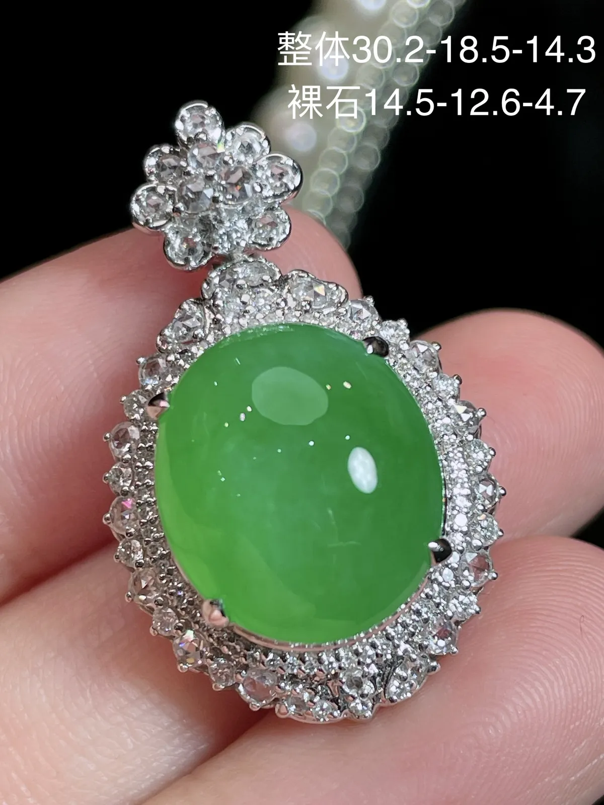 天然缅甸翡翠A货 满绿蛋面吊坠 18k金镶嵌钻石 细腻水灵 实拍接近