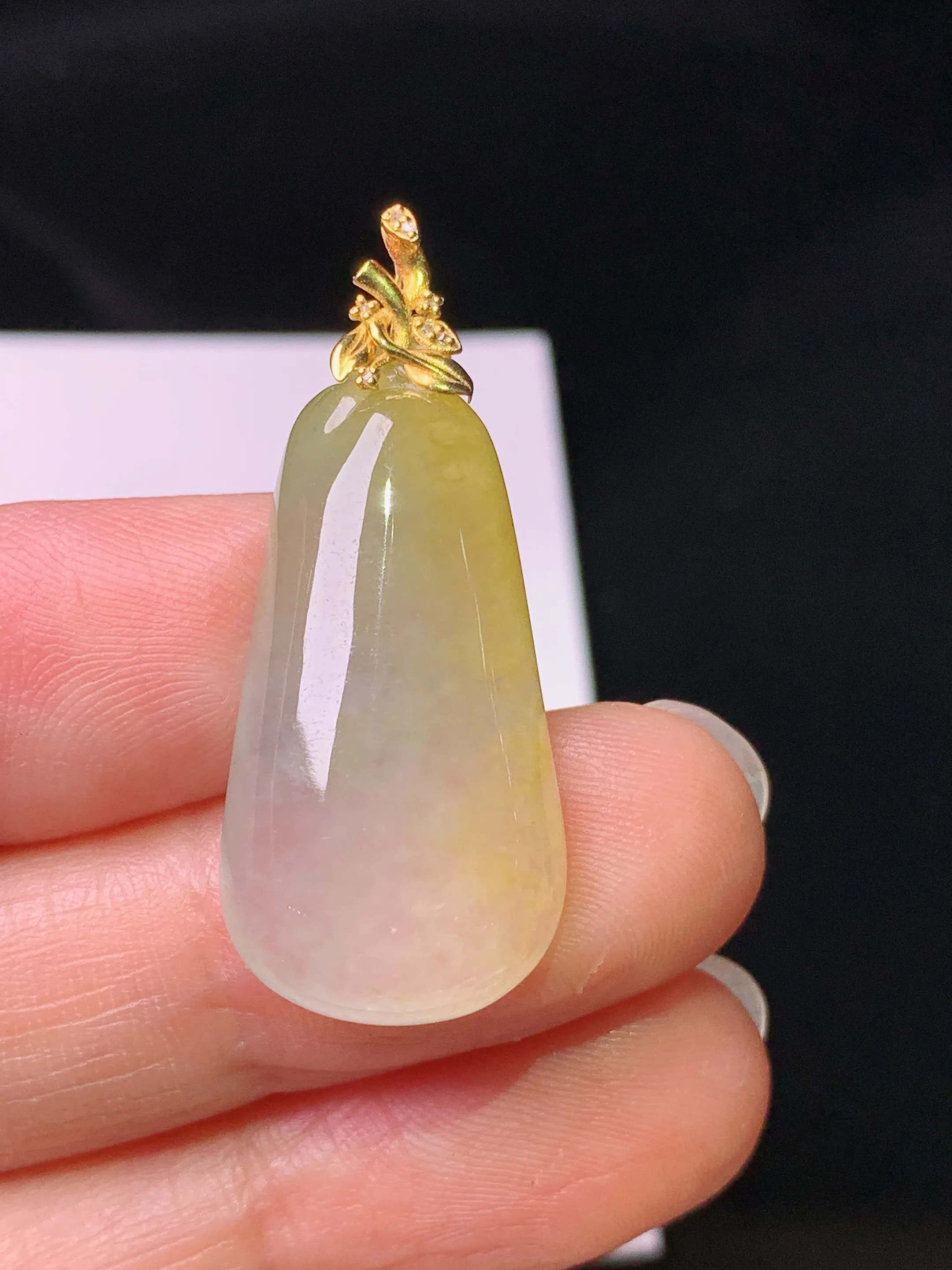 18k金钻镶嵌冰种飘黄翡福瓜吊坠 玉质细腻 色泽艳丽清新 整体尺寸34.3*14.5*6.2