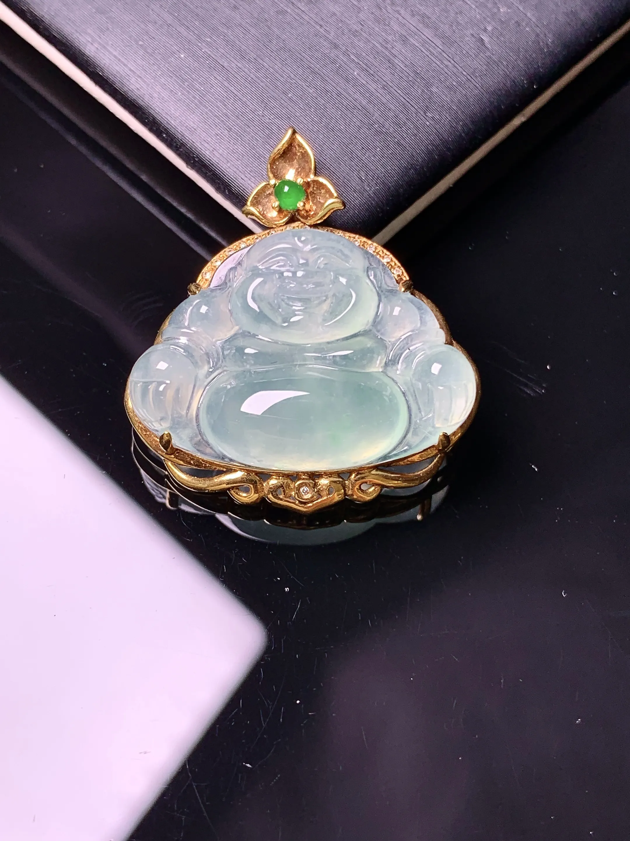 18k金钻镶嵌冰种佛公吊坠 玉质细腻 色泽艳丽清新 整体尺寸27.2*25.5*8.2