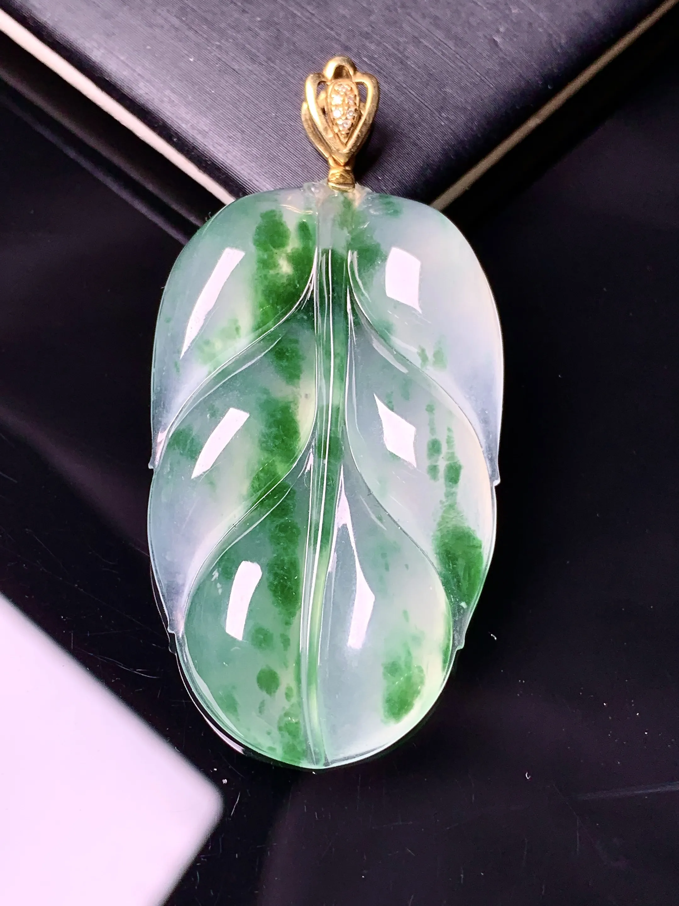18k金镶嵌飘绿树叶吊坠 玉质细腻 色泽艳丽清新 整体尺寸51*24.5*6.2