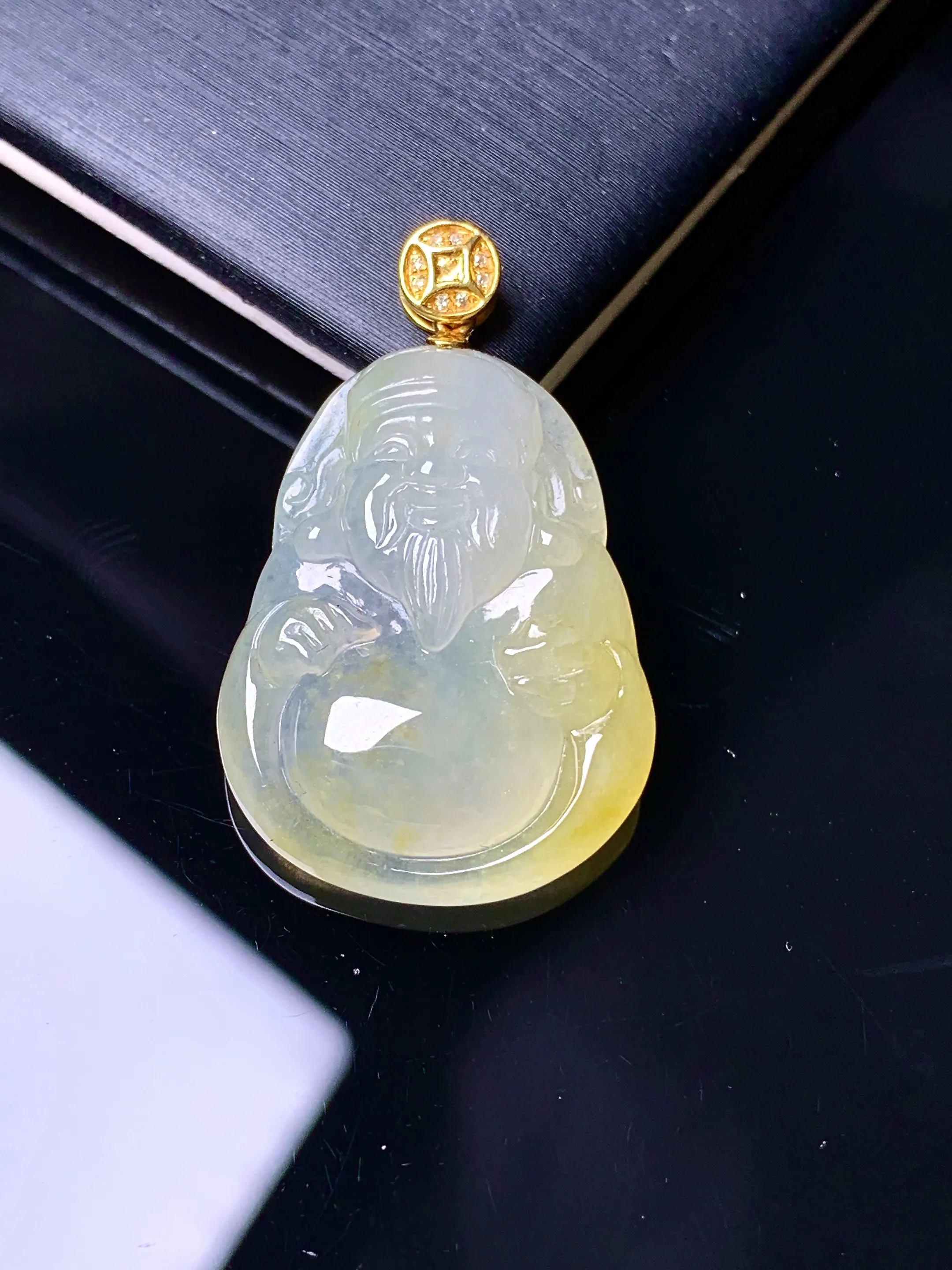 18k金钻镶嵌飘黄翡财神吊坠 玉质细腻 色泽艳丽清新 整体尺寸32.5*20*6