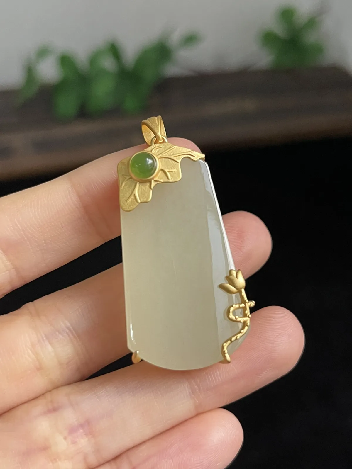 18k金钻镶嵌满绿无事牌吊坠 玉质细腻 色泽清新艳丽 整体尺寸42.3*16.8*9.2