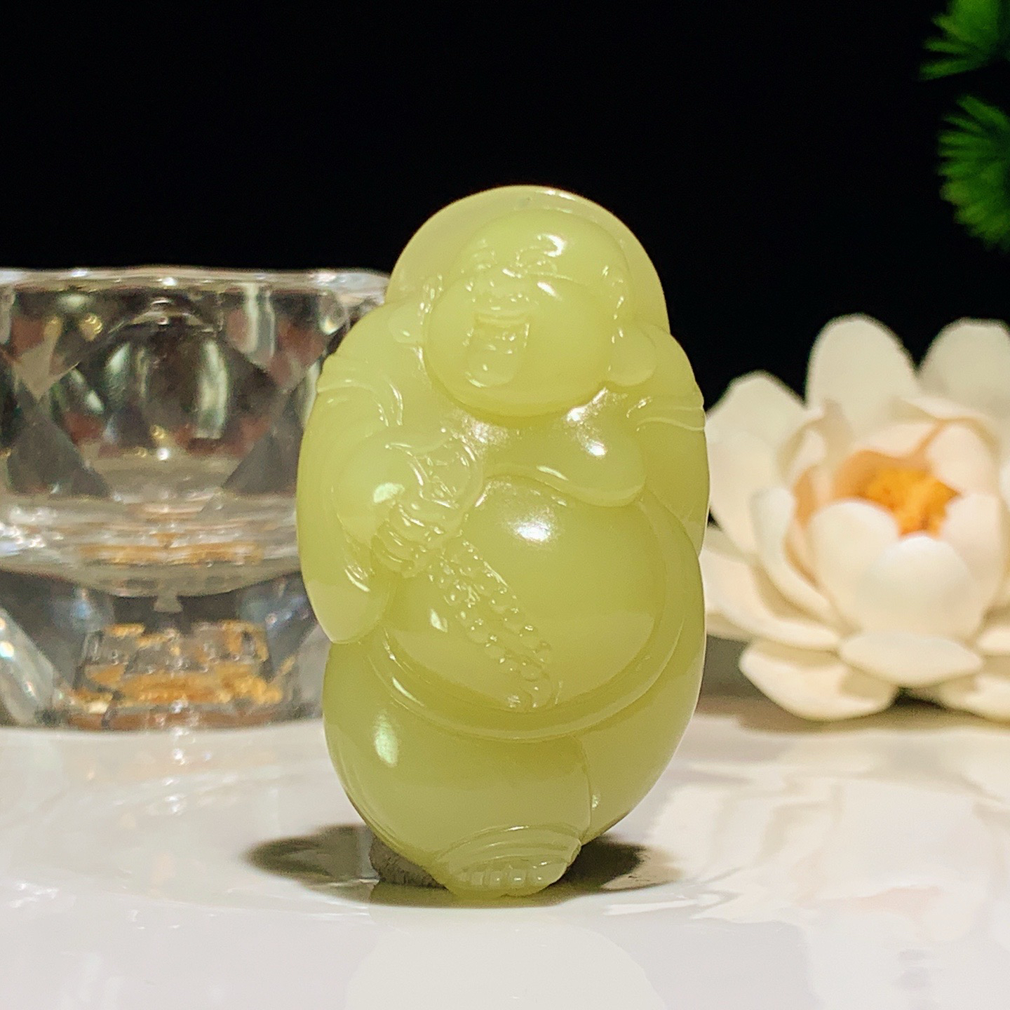 新疆若羌黄口料佛引福来挂件。尺寸52/30/19重40克 玉质细腻油润 底色纯净 脂粉好,品质好。l