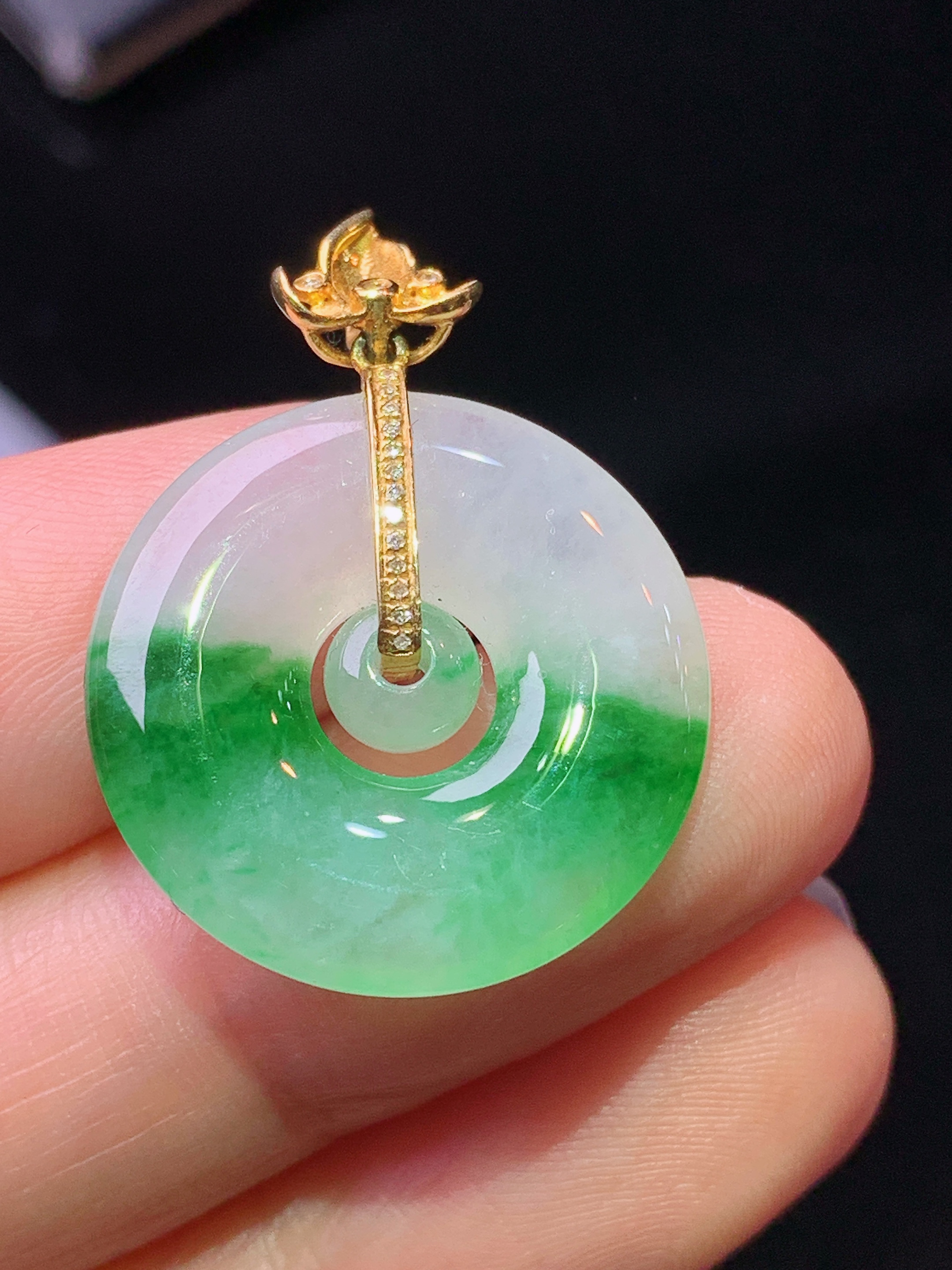 18k金钻镶嵌冰种平安扣吊坠 玉质细腻 色泽艳丽清新 水润亮眼 整体尺寸28.6*22.5*5.3L