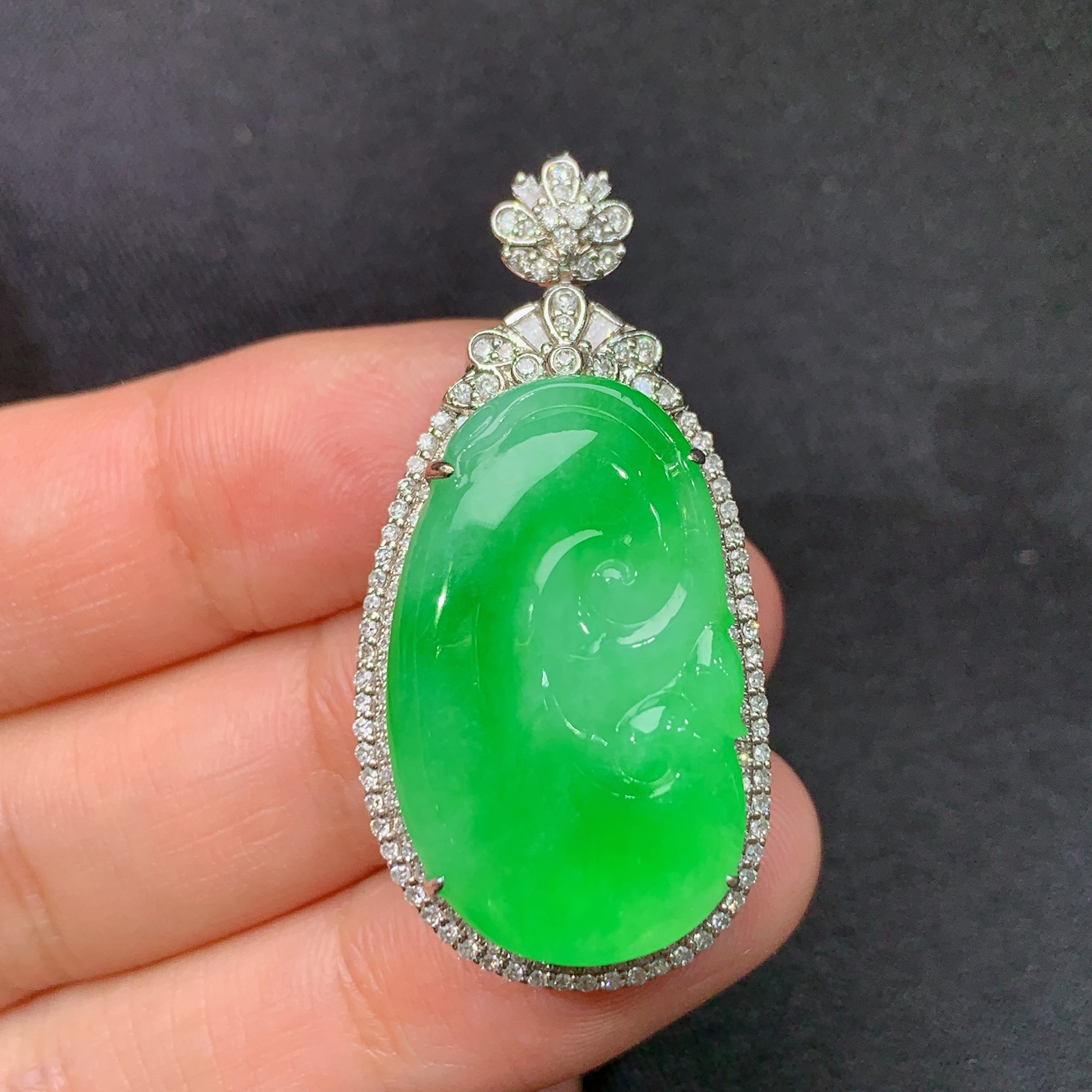 冰阳绿如意吊坠,18k金镶嵌,冰润色阳,玉质细腻,种水足,Xj 尺寸39.1*19.2*11.1