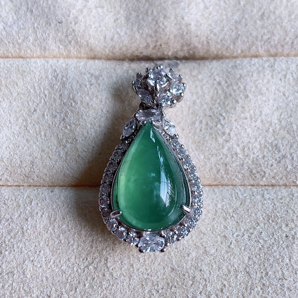 冰水滴翡翠吊坠,款式新颖时尚,日常百搭的款。925银镶嵌 满满的份量感,清新自然 上身效果优雅迷人