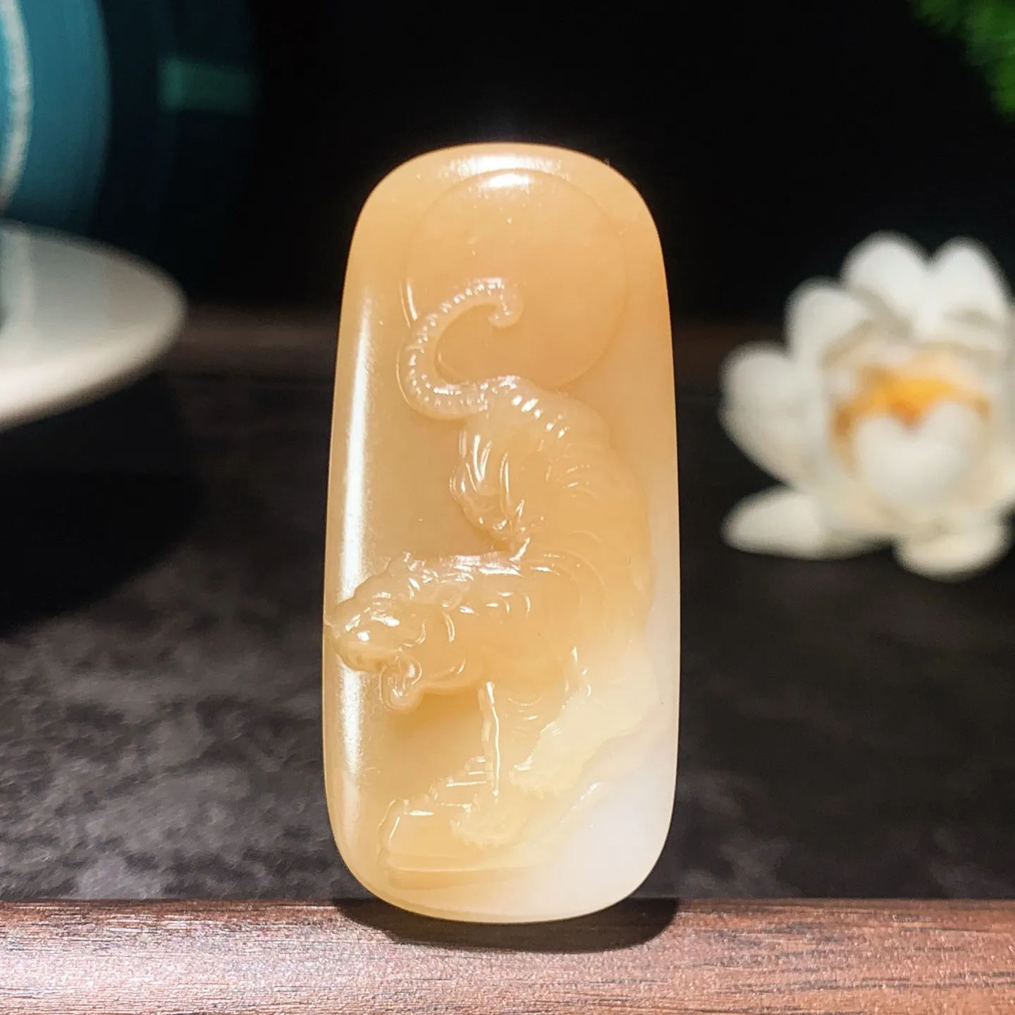 新疆和田玉且末糖下山虎牌子挂件。尺寸47/22/11重24.5克 玉质细腻油润。手推出油。佩戴高端典