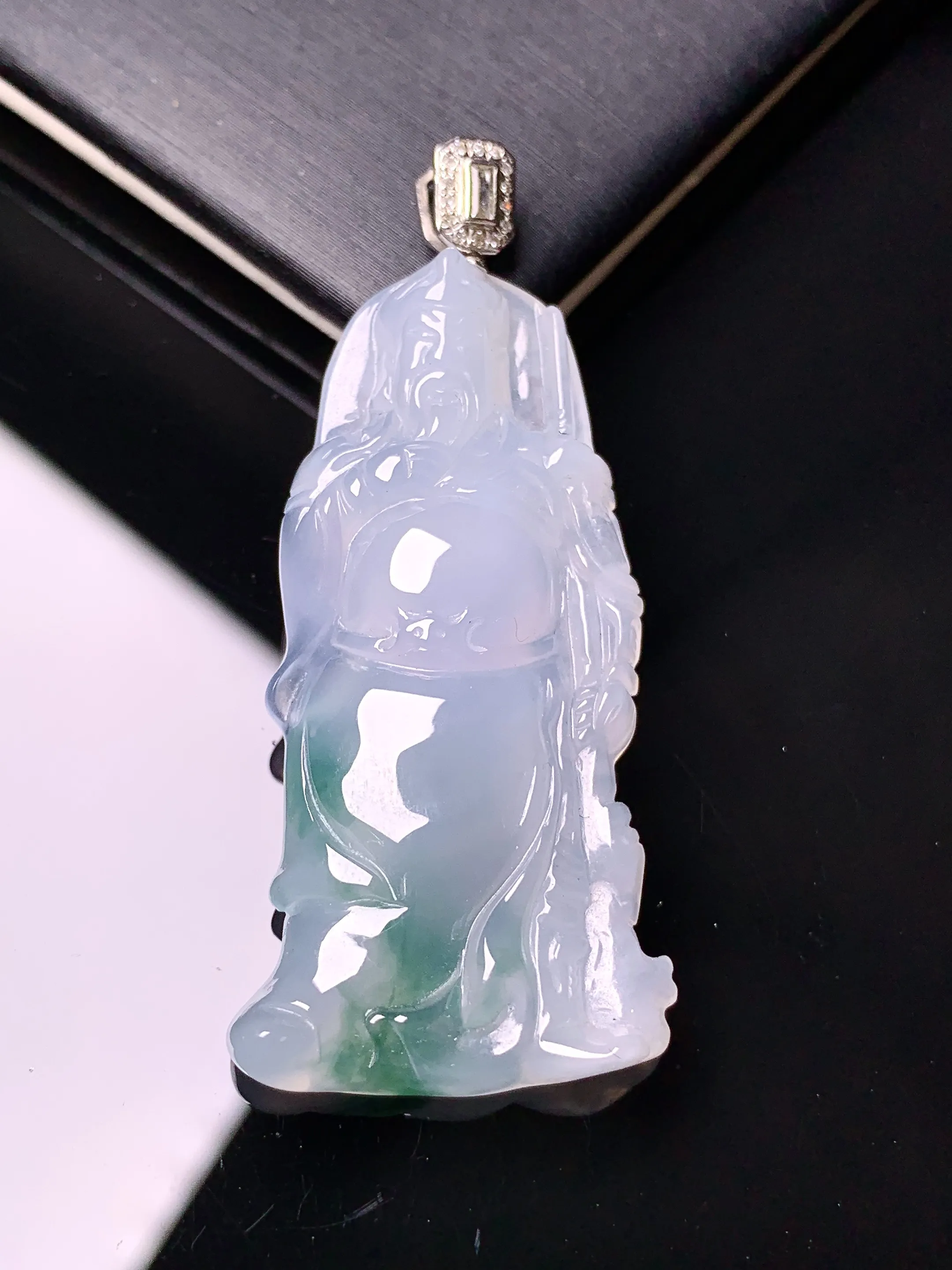 18k金镶嵌飘绿关羽吊坠 玉质细腻 色泽艳丽清新 整体尺寸49.8*21.5*6.2