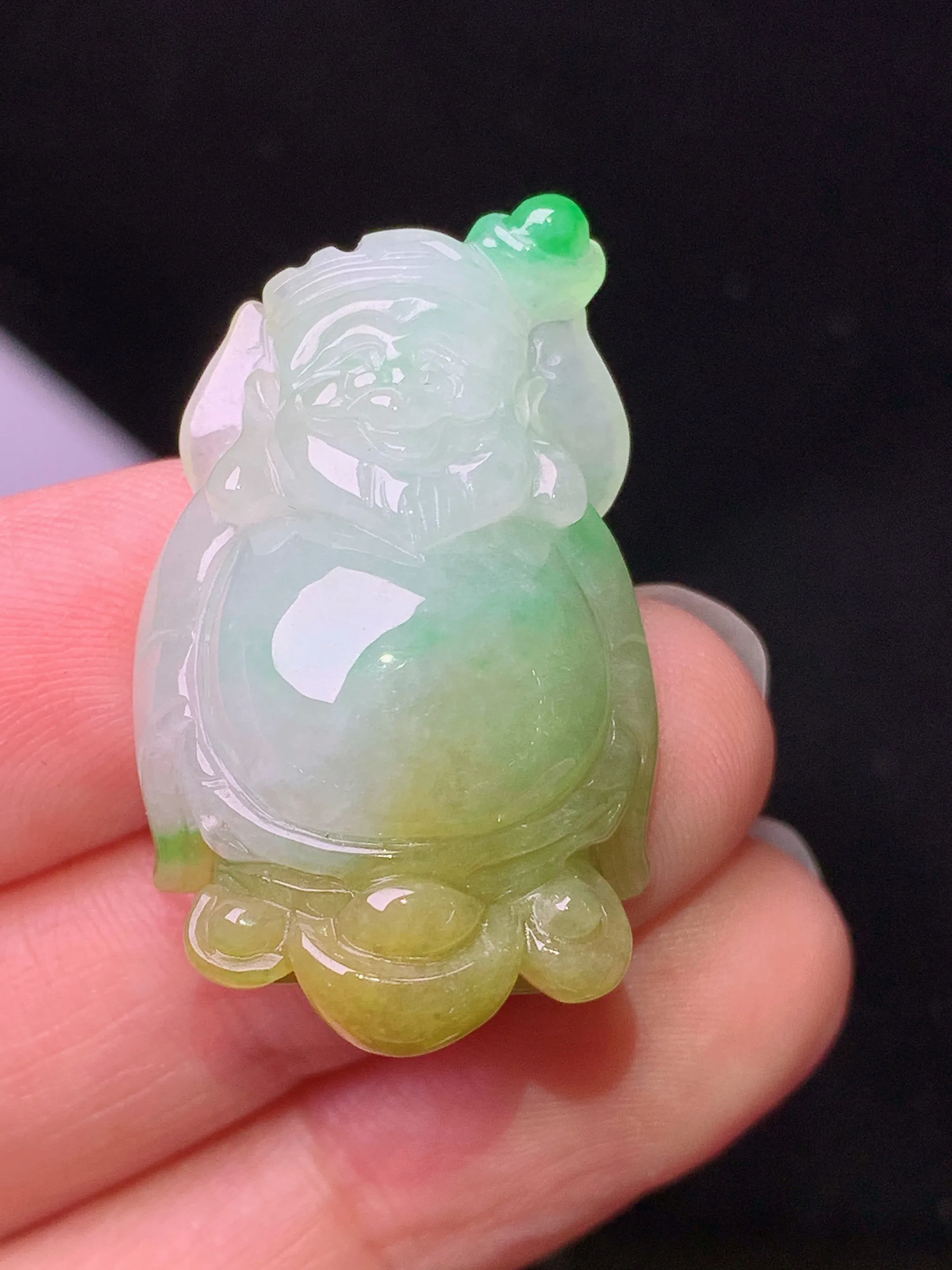 飘黄绿翡财神爷吊坠 玉质细腻 色泽艳丽清新 整体尺寸32.6*20*11