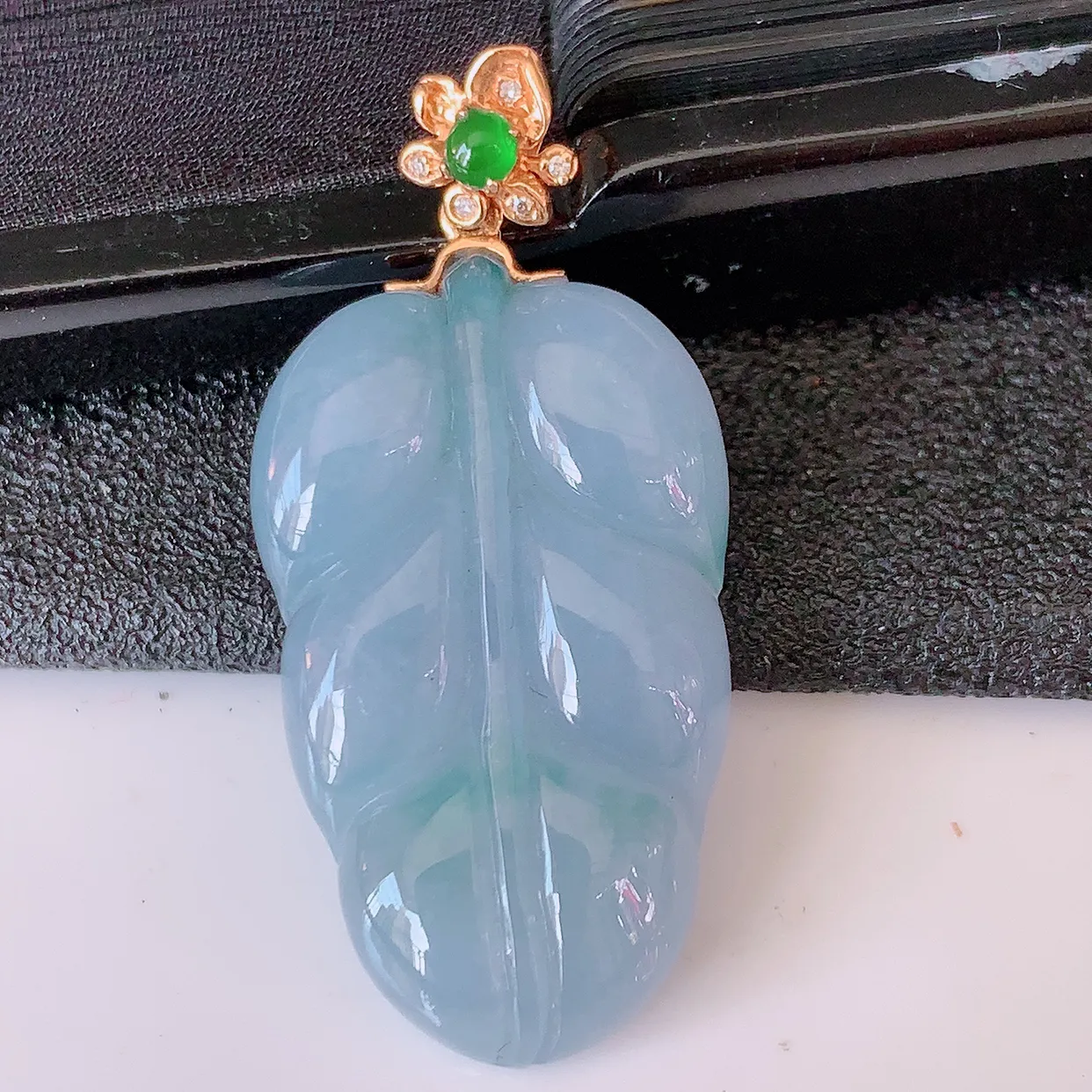 自然光实拍,18K金镶嵌紫罗兰翡翠叶子吊坠,寓意“大业有成,一夜成名,金枝玉叶”水润叶子,翡翠叶子,