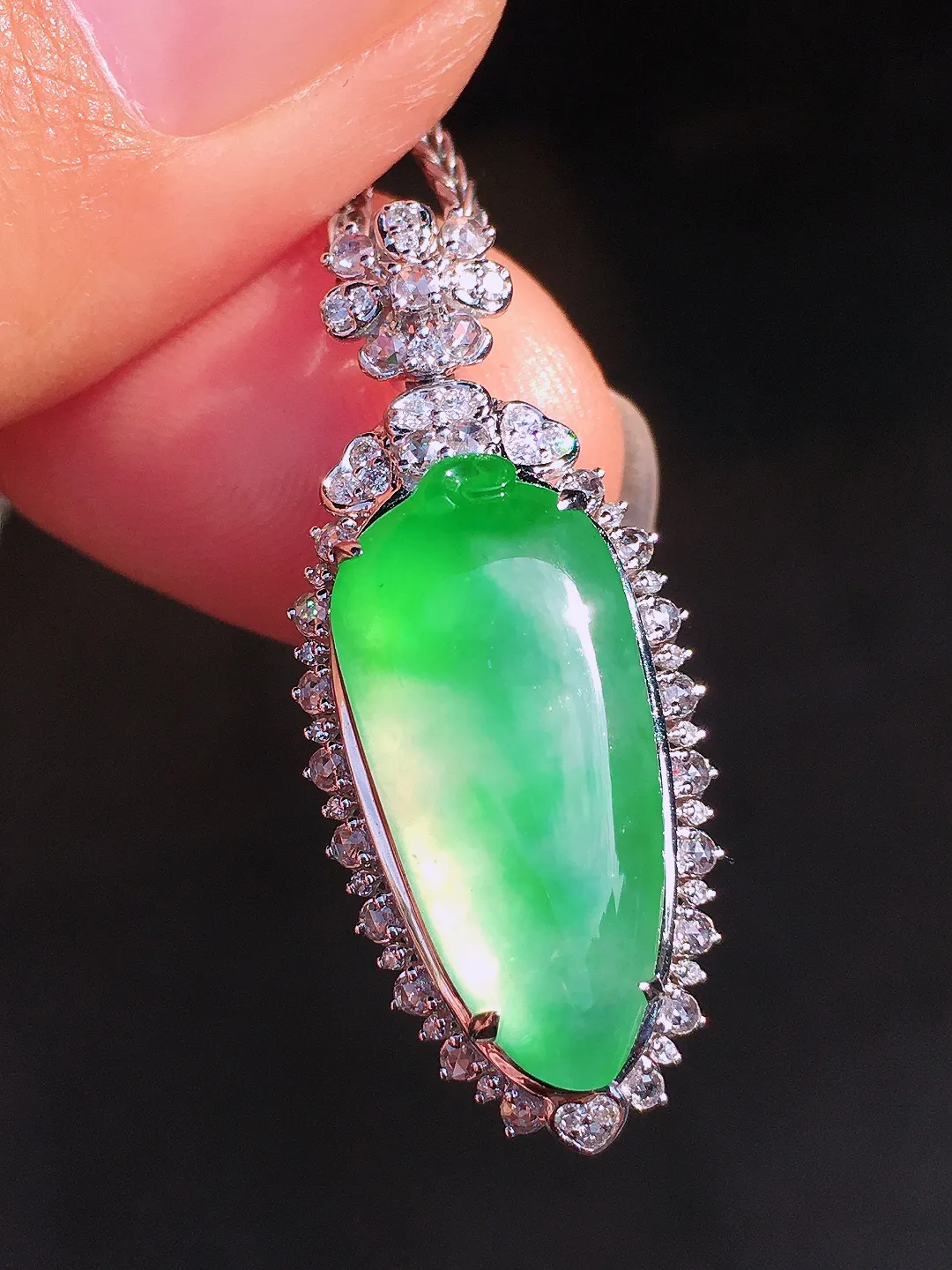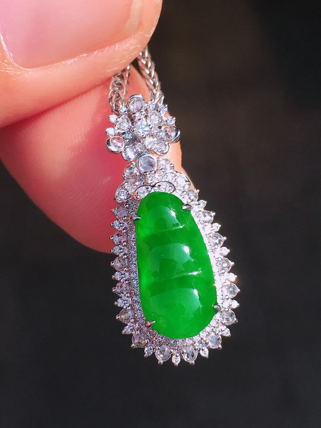 阳绿福豆吊坠,色泽均匀艳丽,玉质细腻,荧光感超 强,饱满圆润,尽显优雅气质,18k 金豪华镶嵌