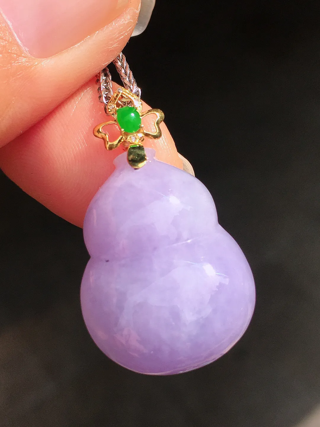 紫罗兰葫芦吊坠,色泽均匀艳丽,玉质细腻,荧光感超 强,饱满圆润,尽显优雅气质,18k 金豪华镶嵌