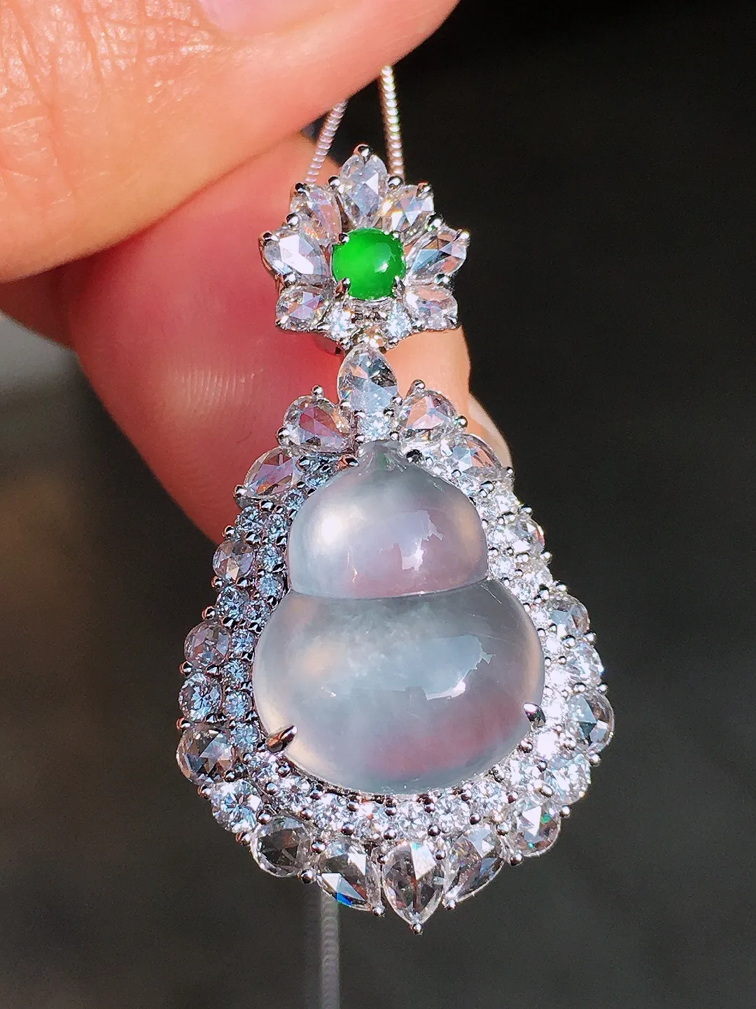 玻璃种葫芦吊坠,玉质细腻,荧光感超 强,饱满圆润,尽显优雅气质,18k 金豪华镶嵌