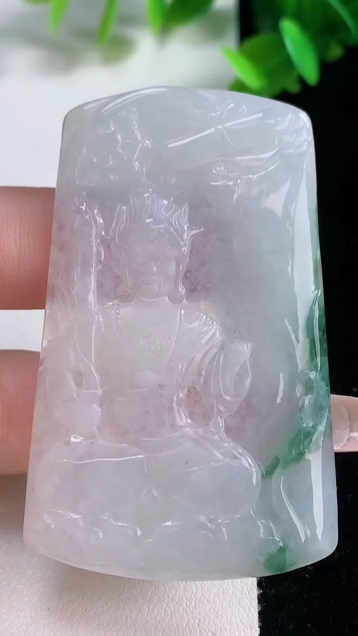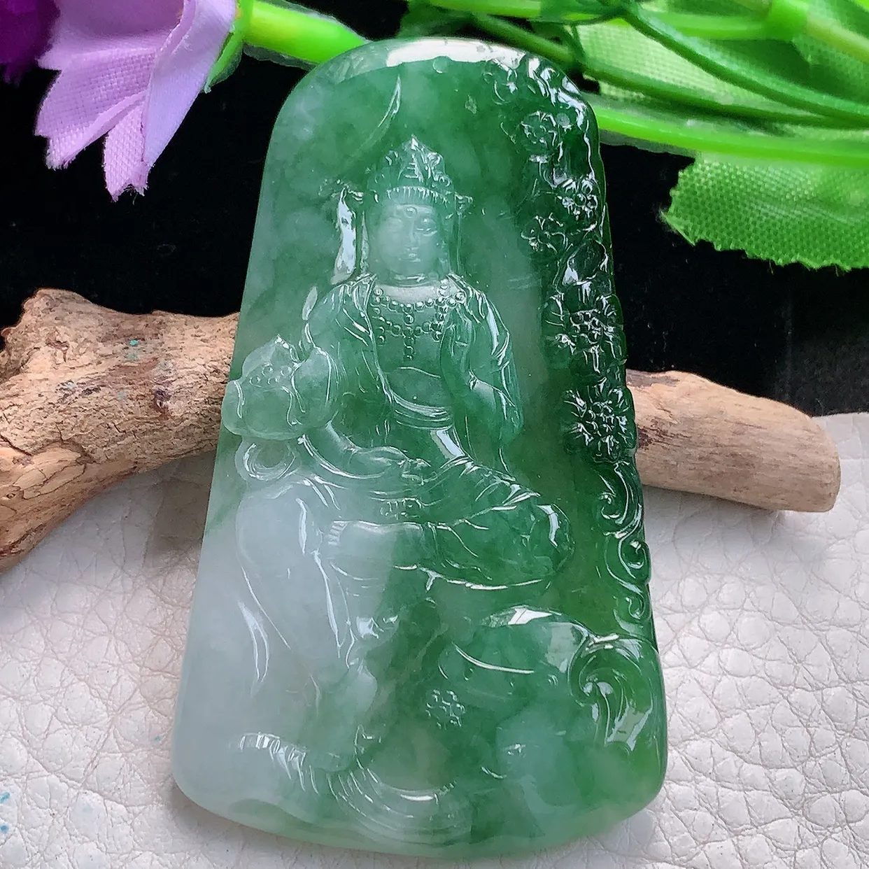 lz实拍65*38*5.6缅甸翡翠精雕辣绿普贤菩萨 生肖守护神玉项坠 玉挂件