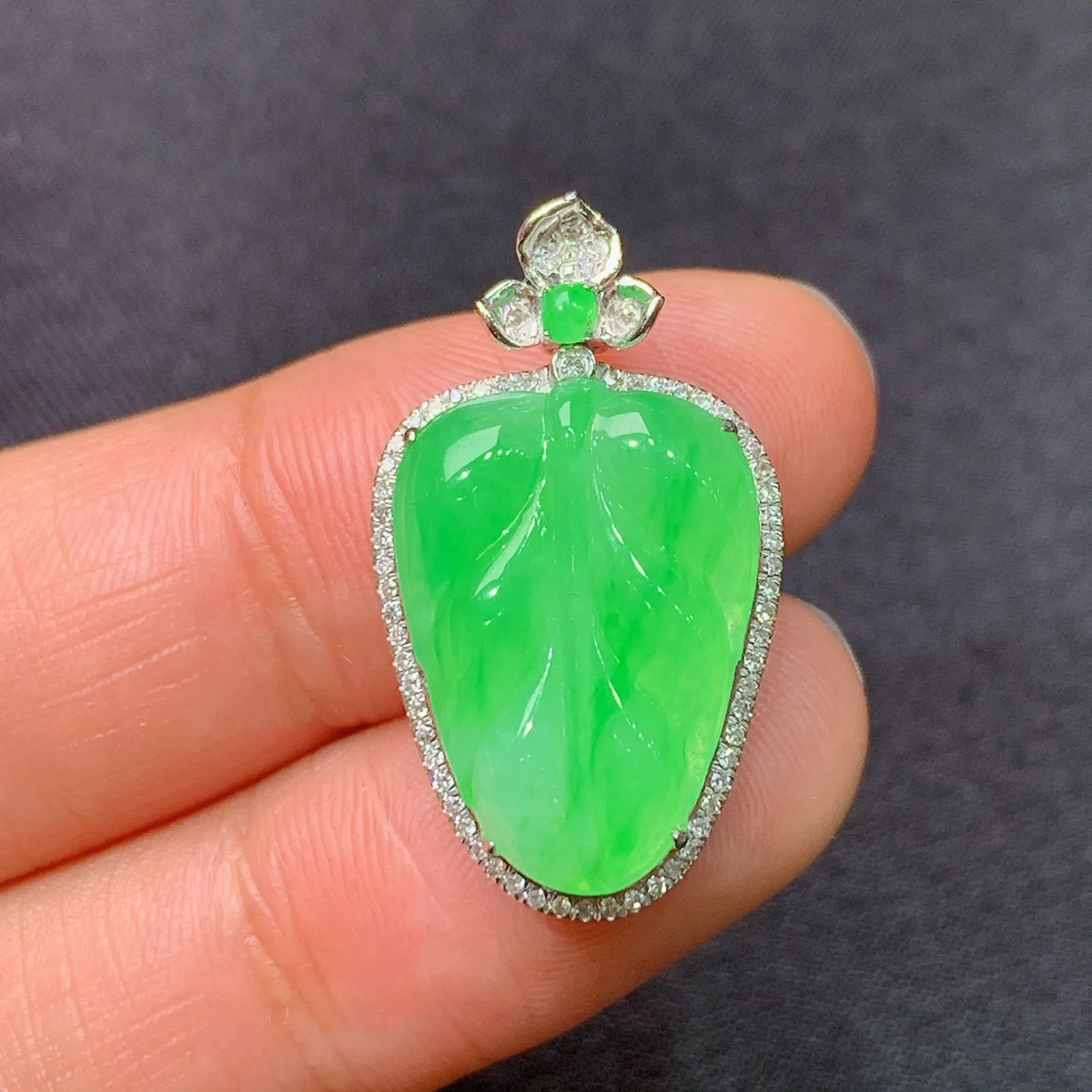 冰阳绿树叶吊坠,18k金镶嵌,冰润色阳,玉质细腻,种水足,Gs 尺寸25.9*14.6*6.8