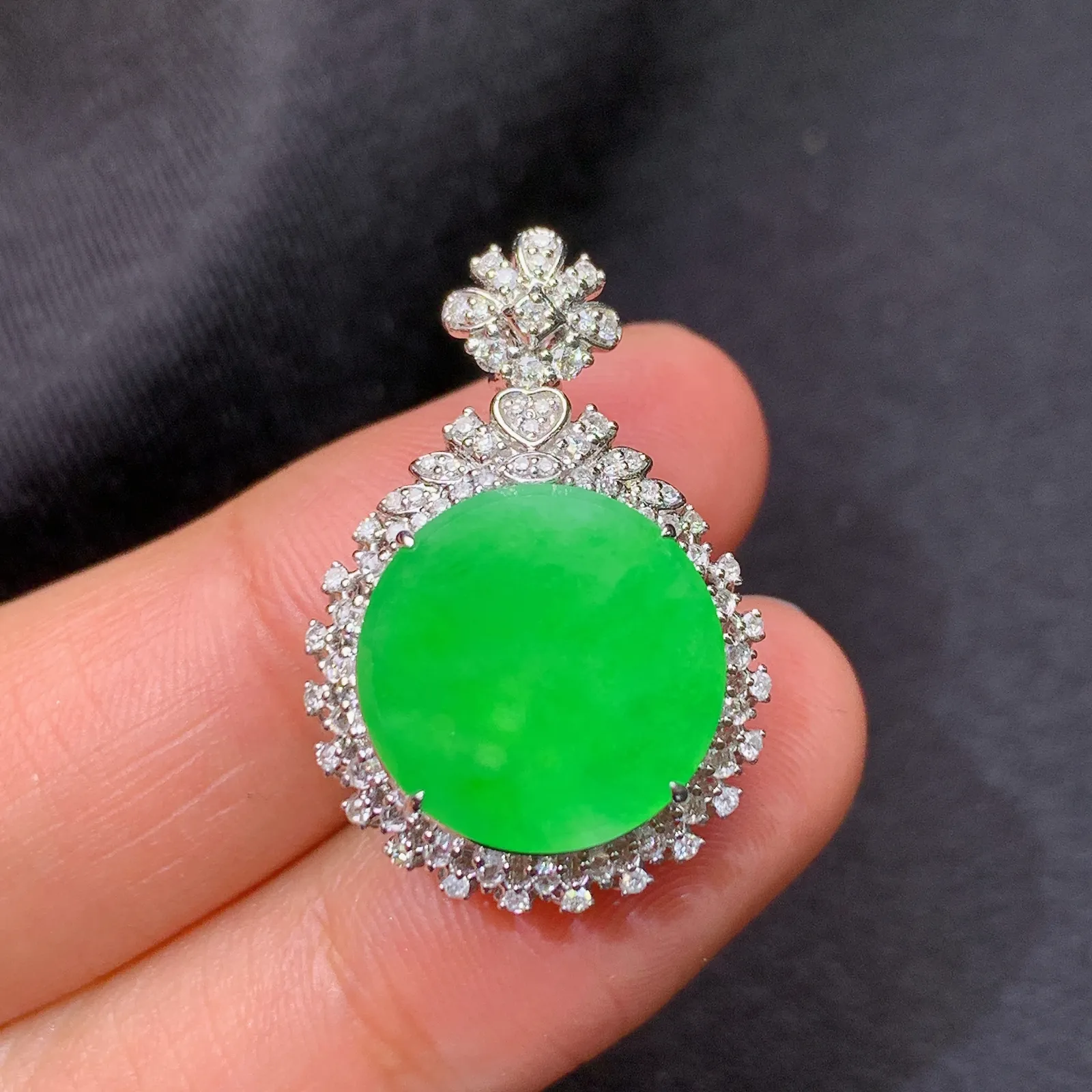 阳绿圆牌吊坠,18k金镶嵌,冰润色阳,种老水足,Cr 尺寸26.6*17.7*9.3