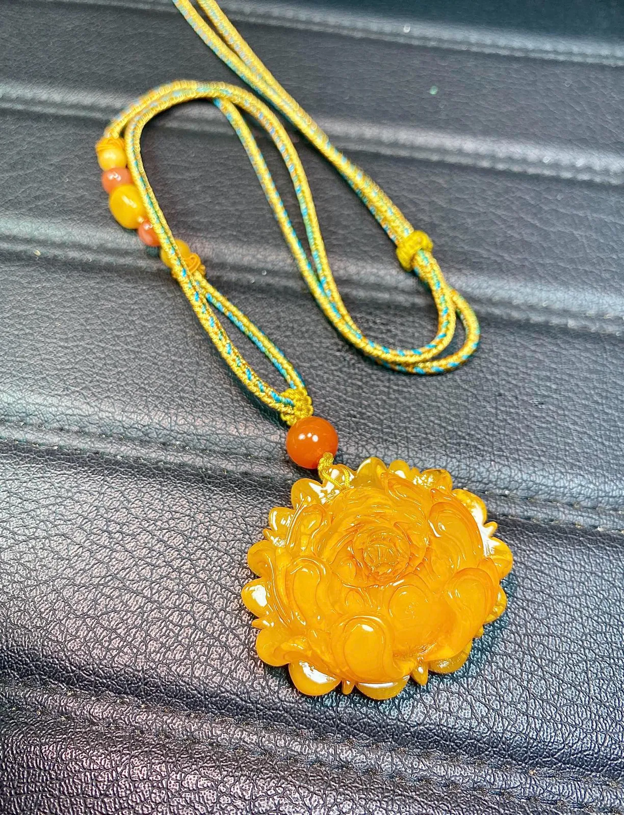 天然蜜蜡 鸡油黄老蜜蜡 牡丹花 花开富贵吊坠~尺寸:36.3×41.8×16.5mm左右 吊坠重:1