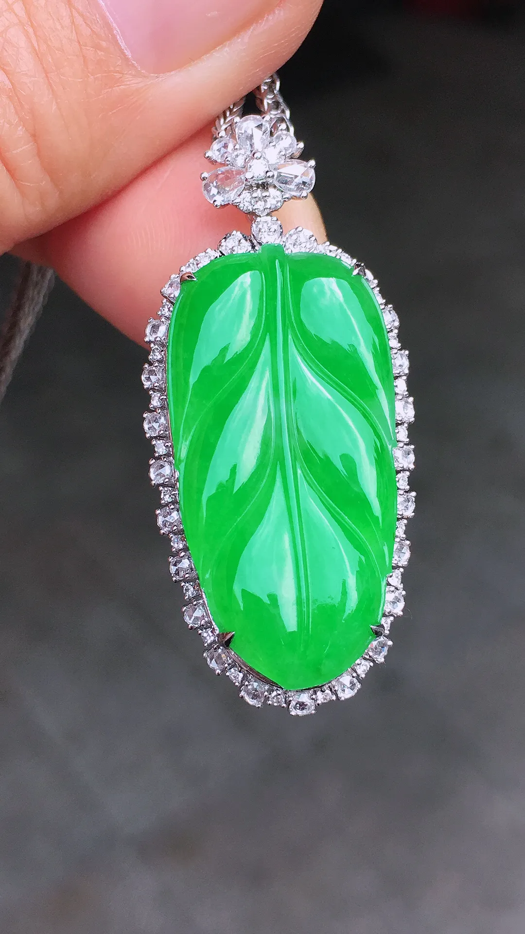 阳绿玉叶吊坠,色泽均匀艳丽,玉质细腻,荧光感超 强,饱满圆润,尽显优雅气质,18k 金豪华镶嵌