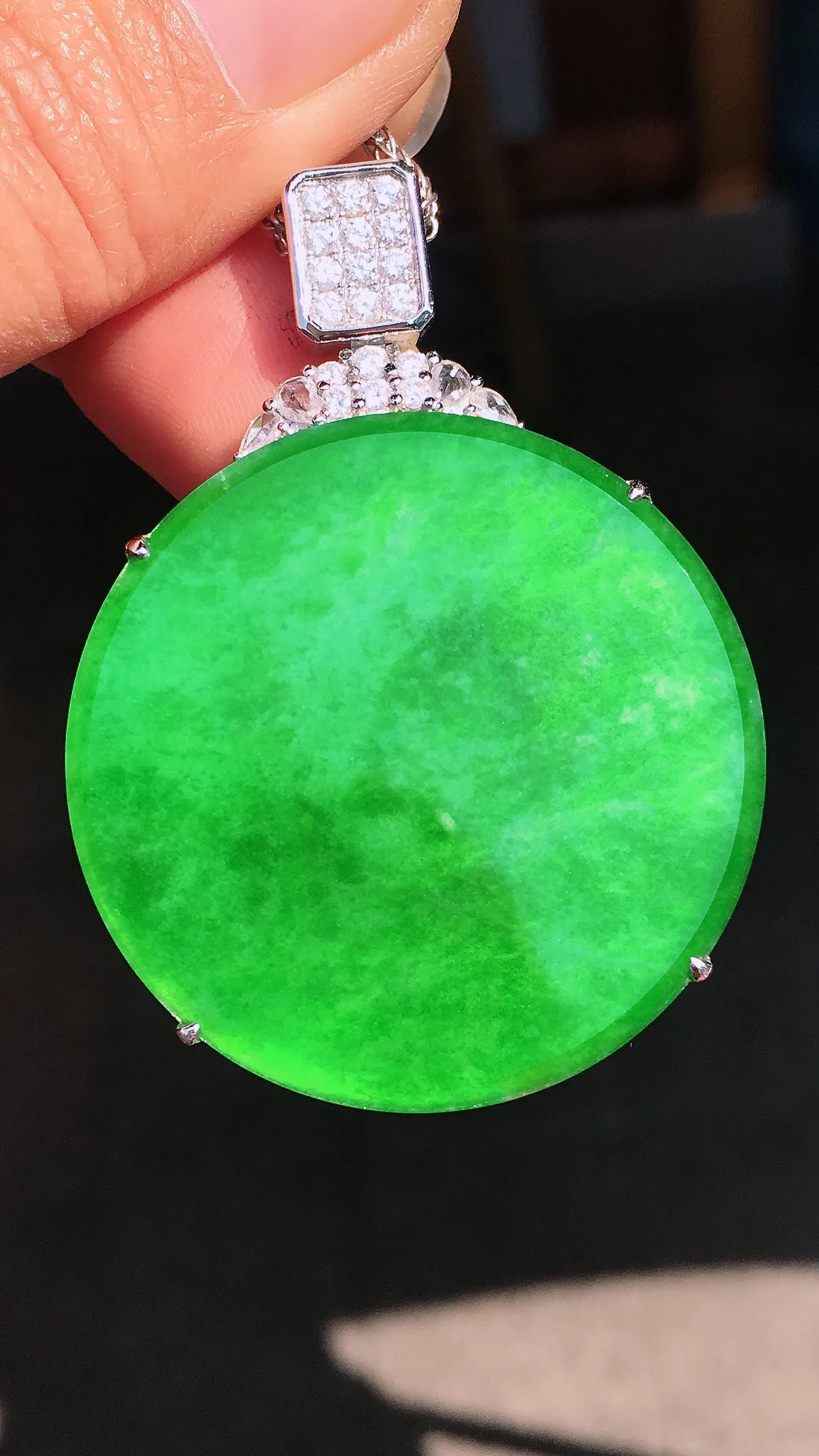 阳绿平安扣吊坠,色泽均匀艳丽,玉质细腻,荧光感超 强,饱满圆润,尽显优雅气质,18k 金豪华镶嵌