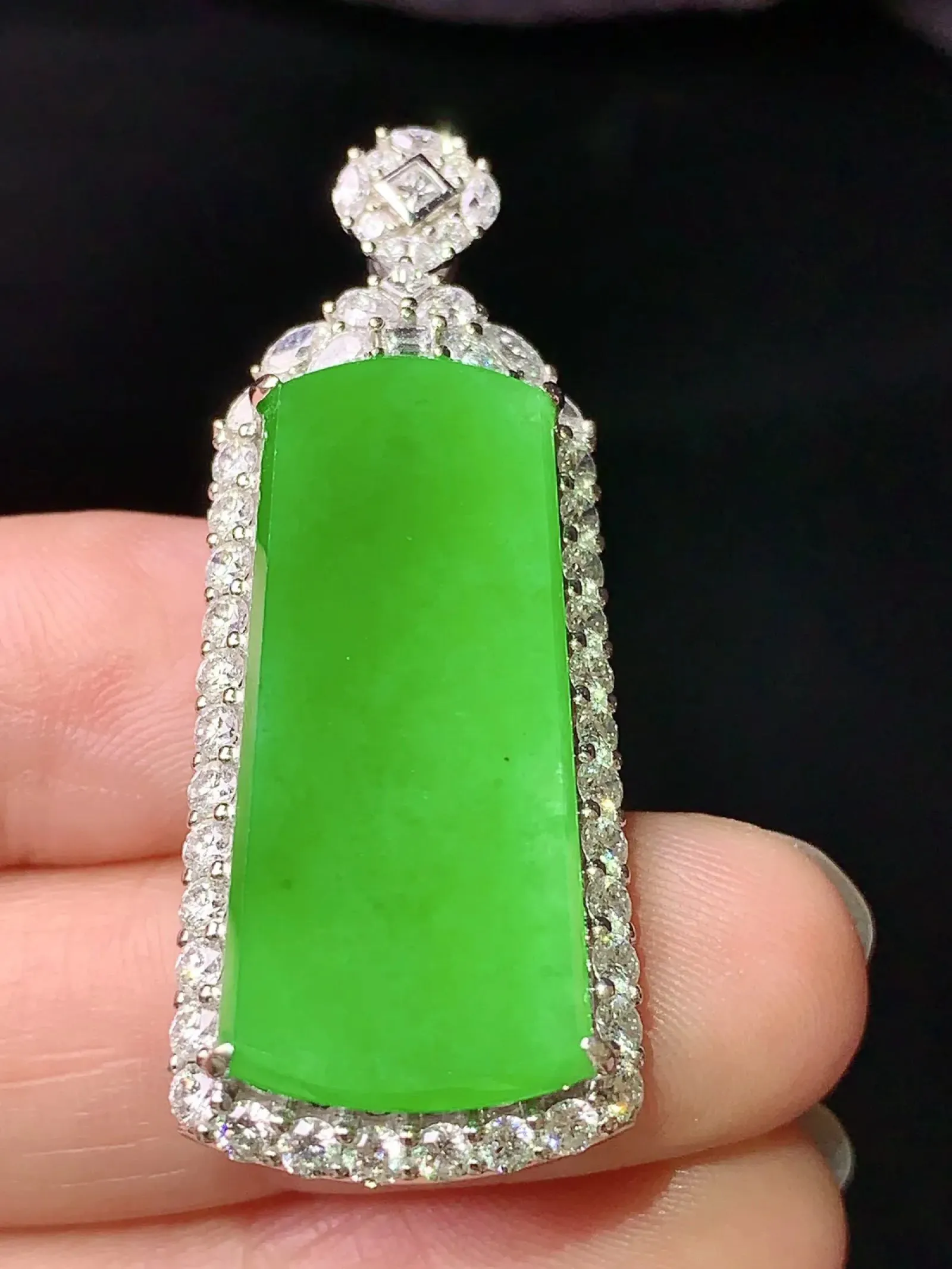 18k金钻镶嵌满绿无事牌吊坠 玉质细腻 色泽清新艳丽 整体尺寸42.3*16.8*9.2